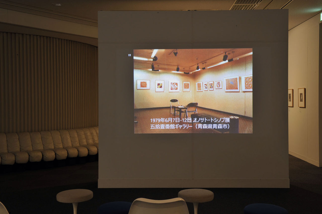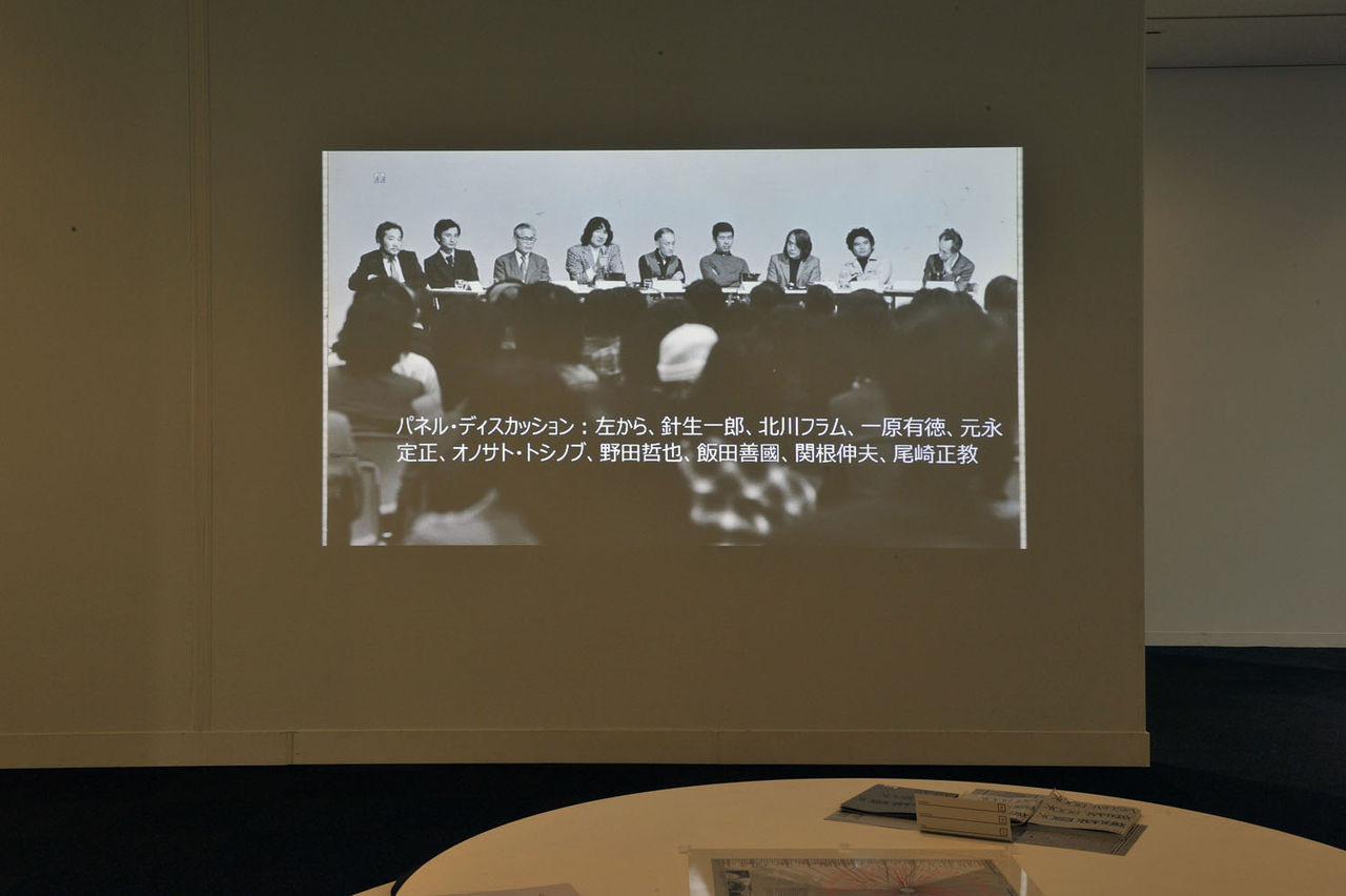 まず、私が声を大にして言いたいのは、これはただの版画展ではないということです。いや、たぶん、この展覧会タイトルをみたら、誰もが版画の展覧会だと思うでしょう。そして会場に並んでいる作品も、基本的には版画作品なのですが、その枠を逸脱するものがあるのです。会場を入ると、靉嘔のシルクスクリーンから展示が始まっています。そこから木村光佑、オノサト・トシノブ……と続いていく展示の流れは、いかにも版画展。小田襄や関根伸夫など立体造形作家による版画に「おや」と思っても、そこまでは基本的に、版画の展覧会です。しかしそのあと、スライド・プロジェクションのコーナーがあります。そこには作品のイメージが投影されているのではなくて、なにやら賑やかに人々の集う展覧会場写真だったり、討論会のようなものの写真だったりが、どんどん映し出されているのです。同時に資料も閲覧できるようになっています。このコーナーを億劫がってよく見ずにとばして、展示作品だけ見てオシマイにしてしまっては、今回の展覧会を楽しんだ、あるいは理解したとはいえません。会場にはこうしたコーナーが3ヶ所あって、とにかくここをじっくり見てほしいのです。