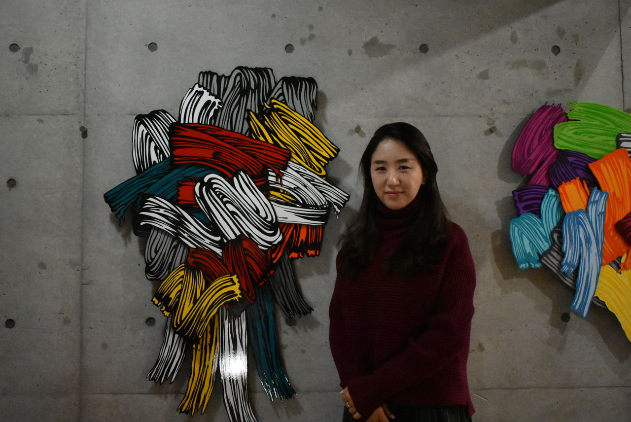 作家のハ・ミョンウンさんと新作の"Firecracker BRUSH"。