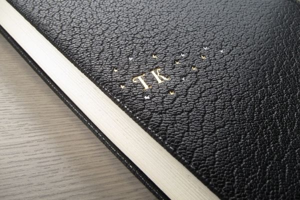 見返しきき紙(表紙の内側にあたる部分)に革を貼る装幀方法。