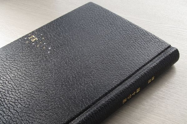 表紙全体を革でおおう表装方法(下図参照)【→半革装】。