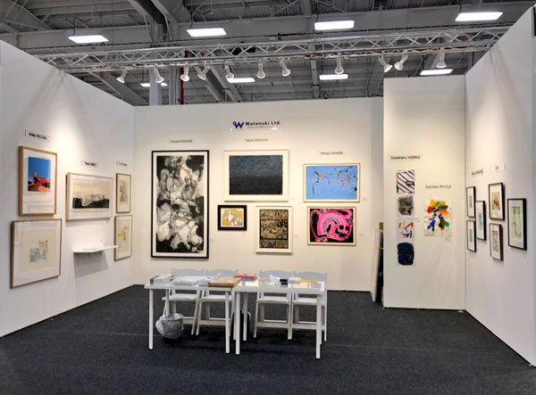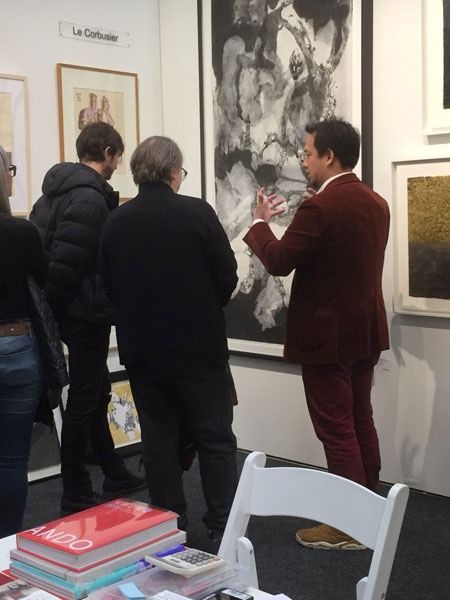 このことは、畳一畳分ある新作の和紙ドローイングを目にした来場者の多くの人が共感してくれた。サイズとしては過去最大の作品だったので、お客さんの「引き」は強かった。ただ、購入するかしないかは、また別の話。四日間、声が枯れそうになるほどひっきりなしに来場者たちと話していると、購入の決め手は、最初に気に入った「深度」であり、そこから予算、飾りたい場所などが考慮されていくという流れが一般的。ここのところが「厳しい目」で査定され、瞬時にハートを掴んだ人だけが、「じっくり」と作品を見てくれるのだ。僕は、この十数秒の「ため」を確保してから、「This is my work」という一言から対話をはじめるようにしている。すると、十中八九「wow, amazing!」という言葉とともに、目が輝き、どうやって描いたの?下書きするの?ここには実在する建築はあるの?などなど生き生きした対話がスタートする。