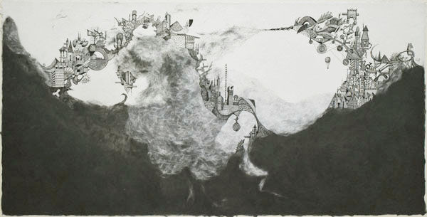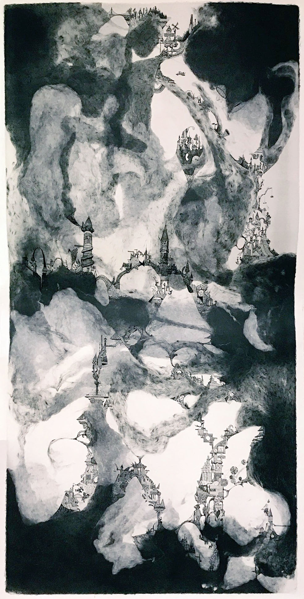 これは、何も思い付きではない。建築家の僕にとって、白紙の紙は、どうにも息苦しい。何故なら、とても綺麗で、文字通り何もないからだ。しかし、建築を設計する時の「敷地」がひとつとして同じものがないように、ドローイングを描くための紙も「白紙」のものを画材屋で購入するのではなく、自らつくるのはどうか?と考えるようになり、2015年からはじめたやり方である。要するに、僕の場合、ドローイングを描く前の段階から創作がはじまっており、世界に一枚しかない紙から幻想都市風景を想像(創造)するのだ。