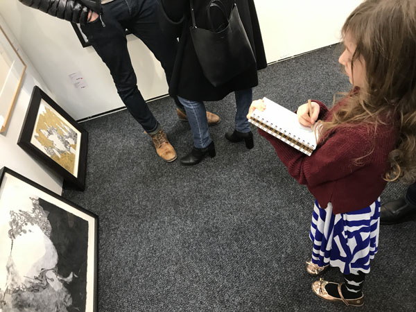 今年は、家族連れのお客さんが多かったように思う。そして、驚いたことに、美術館のキュレーターだというお母さんと僕の作品の前でお話していたら、六歳の娘さんが僕の作品をえらく気に入ってくれて、その場でスケッチブックを取り出した。なんと、いきなり「模写」をはじめたのである。更に鞄から色鉛筆まで取り出して、色も載せたのだ。きっと、僕の白黒のドローイングは、彼女の目には色鮮やかな風景として映っていたのだろう。売れる・売れないは、多分に運の良さも必要だが、来場者たちと交わすこうした交流は、作品をつくり続ける作家にとって、たいへん貴重な意見交換の場所でもある。昨年、僕のドローイングを購入してくれた方々とも再会し、ライターの方から取材を受け、アーティストの方には「感動したから君の似顔絵を描きたい」と言われたり、大学教授の方から「うちでアーティスト・トークしてくれないか?」などの依頼を受けたり、今年も実り多き時間であった。