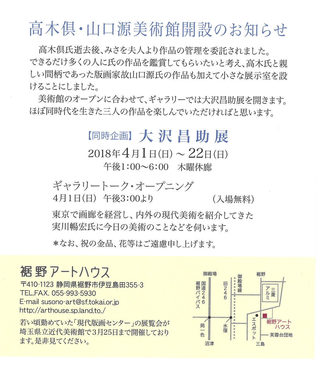 水口さんが静岡県裾野市でずっと美術の仕事を続けていたのは聞いていましたが、このたび上掲の挨拶にあるとおり、自宅の一角に高木倶・山口源を記念するスペースをオープンすることになりました。どうぞお近くの方はぜひ訪ねて、水口さんを応援してやってください。