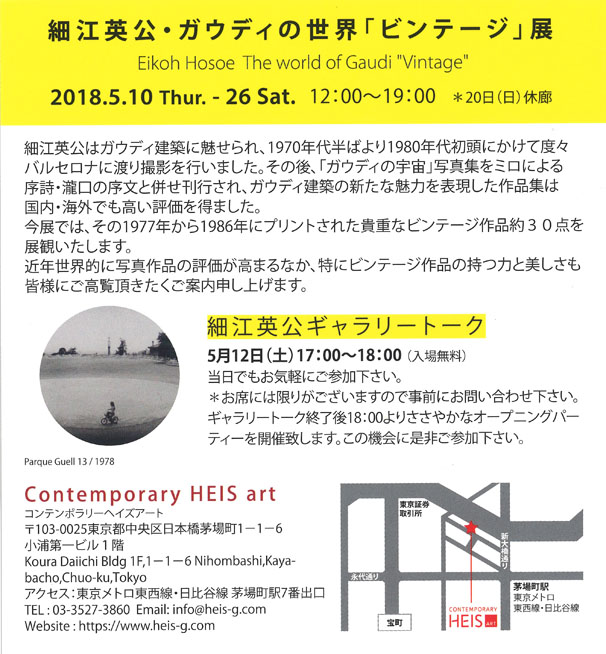 細江英公先生のガウディ連作のビンテージ展が日本橋茅場町のContemporary HEIS artで開催されます。出品作品の多くは1部しかないうえに、稀少なビンテージです。