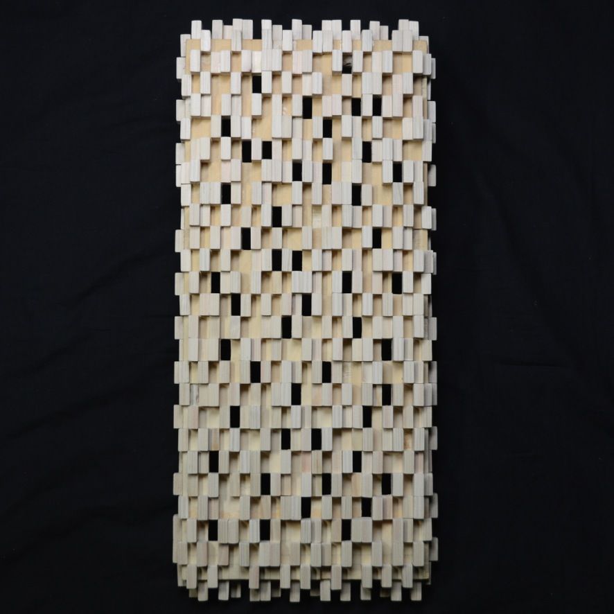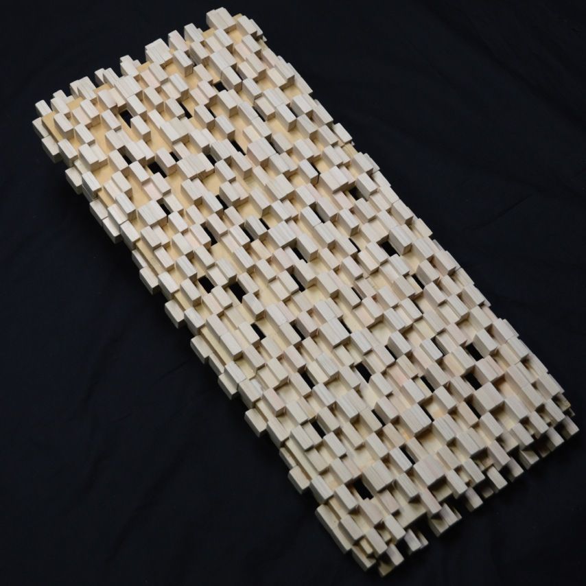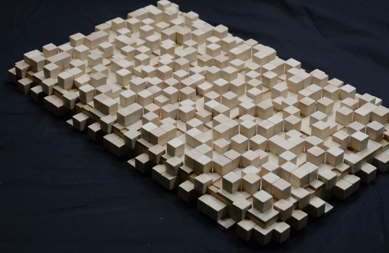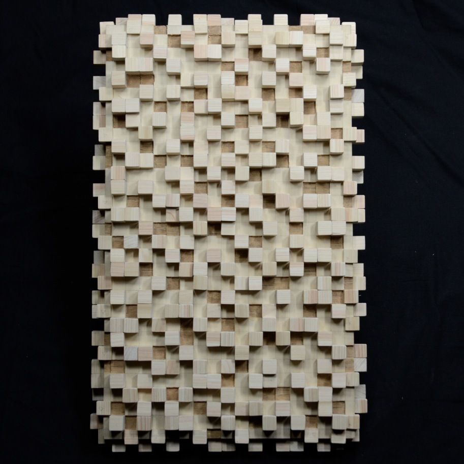 前作は平面のパネルに立方体を貼っただけでしたが、今回は凹部分を彫刻刀で彫り、凸部分に半分の高さのものもあるのでだいぶ変化がでました。