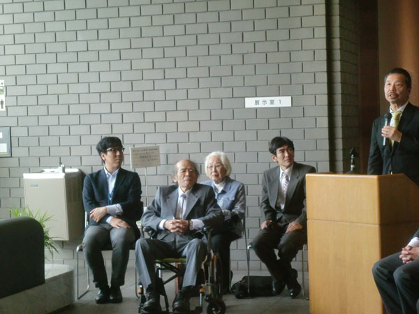 右から新たに館長に就任した秋元雄史さん、ご子息の池田哲さん、夫人の紀子さん、池田龍雄先生、担当学芸員の喜夛孝臣さん