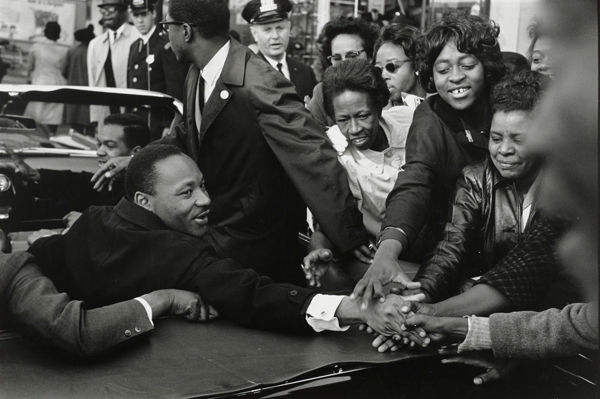 車上で警護をする男性たちに囲まれながらも、なんとかキング牧師と握手をしたいと手を伸ばす黒人女性たちと、背後に居並ぶ白人警官が画面の中に捉えられており、黒人たちの熱狂と、それを見つめる白人の視線という関係の中に、当時の状況が凝縮されています。
