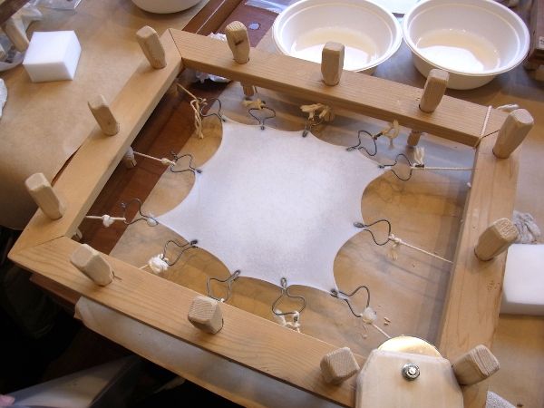 紙を漉く前に、楮・三椏・雁皮などの皮(繊維)や粘着材としてのトロロアオイなどの主原料と下ごしらえの説明を受けました。すのこに枠と持ち手のついたような専用器具に液を流し込み、前後左右に動かしながら漉いていきます。1畳ぐらいの大きさに挑戦させてくれるかと鼻息を荒くしていましたが、そうは問屋がおろさず、可愛らしいハガキサイズの和紙を漉きました。職人の方に和紙の出来より漉く動作(?)が上手と褒められたことを覚えています。