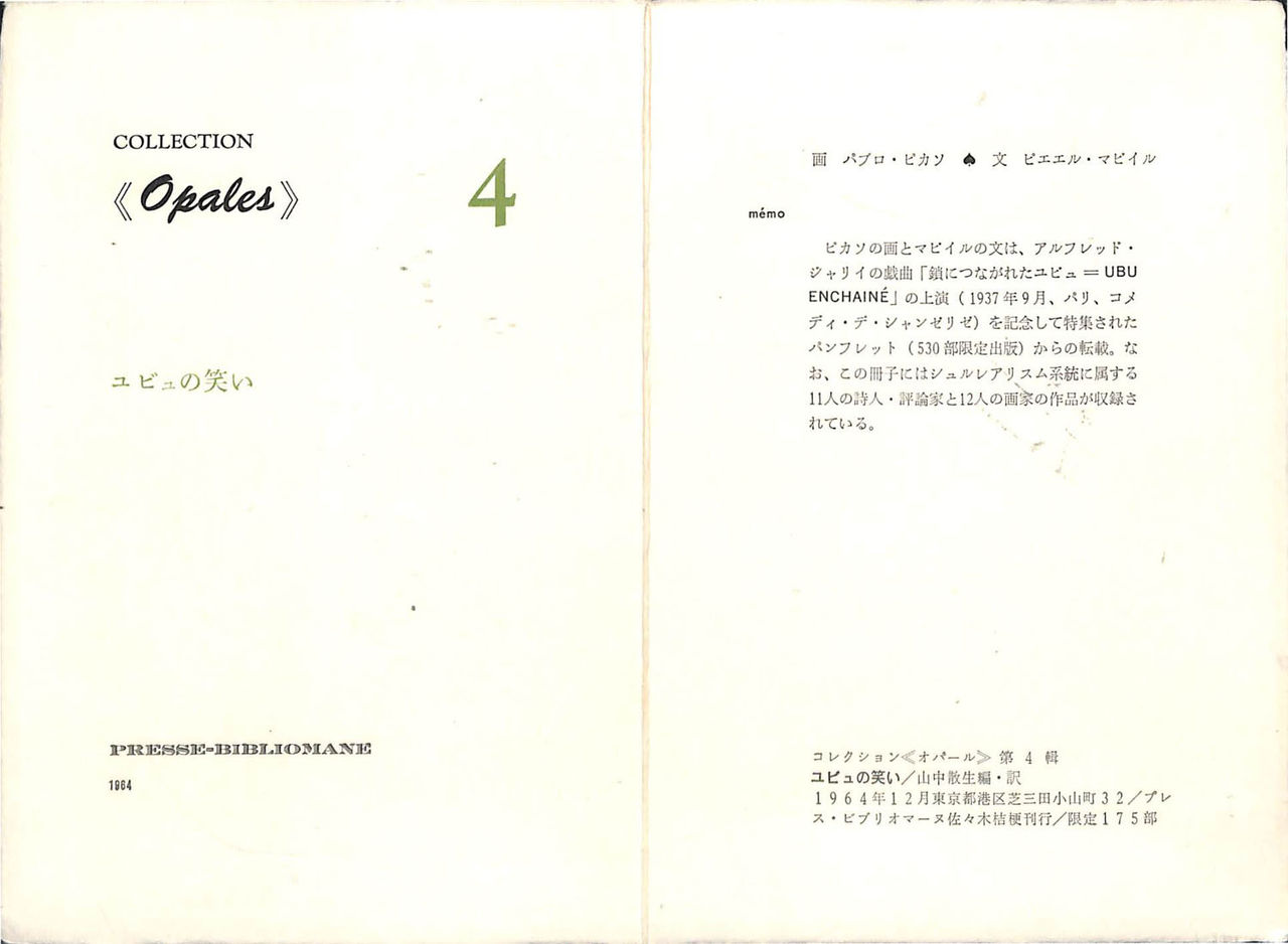 その内容は、シュールレアリスム系の画1枚と文章1編を、見開きで印刷したものです。編集、翻訳は、日本を代表するシュールレアリスム詩人で、蔵書家でもあった山中散生氏が担当しました。