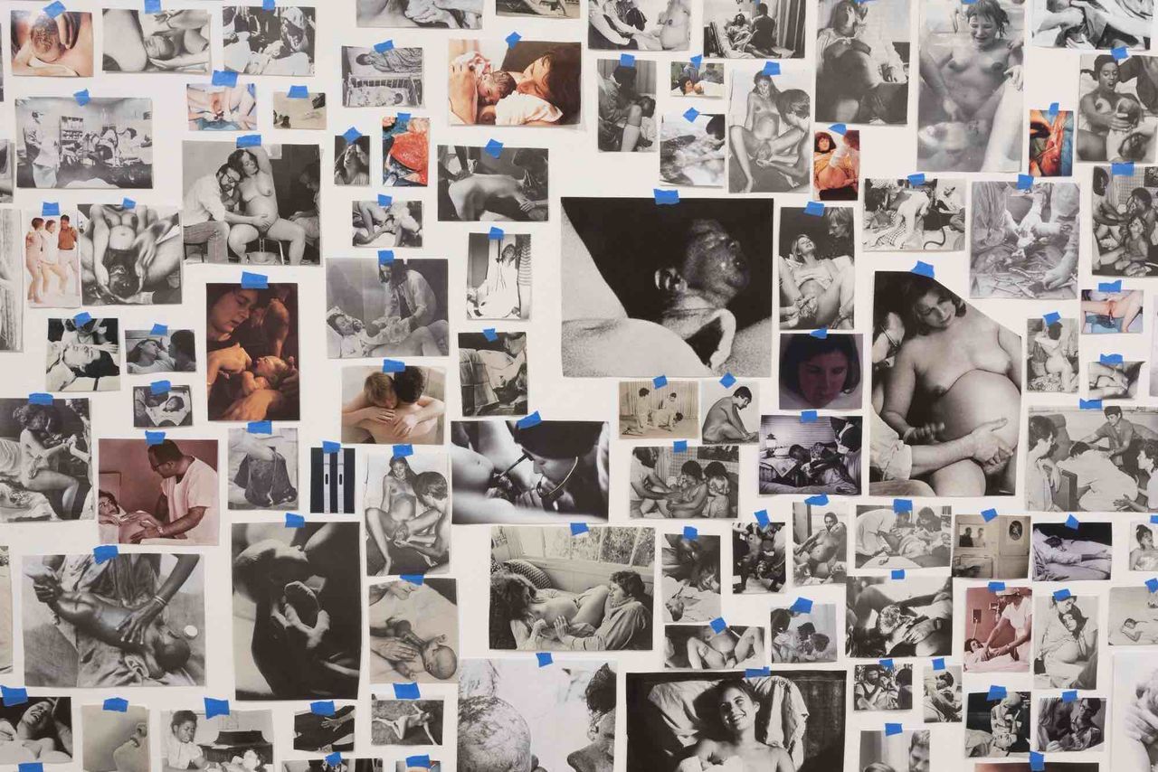 ワイナントは、数年間かけてパンフレットや雑誌、書籍、個人的な写真(助産師や妊産婦から提供を受けたもの)などから蒐集した出産にまつわるよそ2000点の写真(臨月期から、分娩、出産直後の授乳までも含む)を、展示室をつなぐ幅およそ6メートル通路の壁に、作業用の青い粘着テープで壁を埋め尽くすように貼っています(図2)。展示に使用された写真は白黒写真とカラー写真が入り混じり、妊産婦の外見や周辺に配置された医療器具や室内の状況から、1960年代以降に撮影されたものと推察されます。印刷物として発表された分脈や付随する文章などの情報などが削がれ、匿名性を高めた状態で断片として展示されているために、妊娠や出産という極めて私的な経験の局面を捉えた写真でありながら、個人性や主観性が削り取られ、鑑賞者は無数に繰り返される妊娠と出産という現象そのものを捉えた写真の集積に対峙することになります。