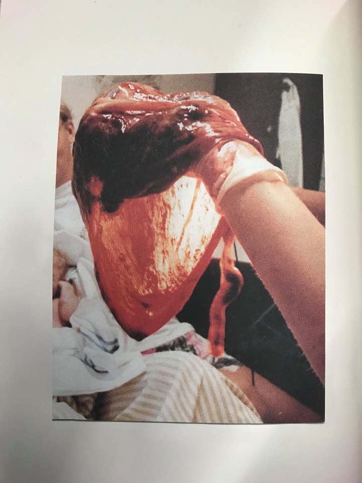 個別の写真からは、さまざまな女性たちが出産を経る中で痛みに耐えて顔を歪める表情や、自宅出産で配偶者や助産師が介助する様子や妊産婦のさまざまな姿勢、医療機関での処置、子宮口が開いて膣から赤ん坊の頭が母胎から出てくる様子など、出産過程の詳細を仔細に見て取ることができます。写真を撮った人たちが、どのような立場としてーー配偶者、家族、助産師のような介助者、産科医などーー出産を見つめているのかということを写真から判断することはできませんが、一連の写真のシークエンスは、出産の場面に擬似的に立ち会って観察しているような感覚を読者にもたらします。写真集は、新生児を胸に抱き、乳房をふくませる母子の写真群で締めくくられますが、その直前には、分娩時に胎内から出てきた胎盤を捉えた写真が10点余り(中には、ページ全体を覆う大きな図版もある)掲載されています。このように胎盤を即物的に提示することは、出産を個人的な経験として主観的な視線から捉えて描き出すのではなく、生命活動、生殖という現象の一部として位置づける表現を追求するワイナントの姿勢の表れともいえるでしょう。