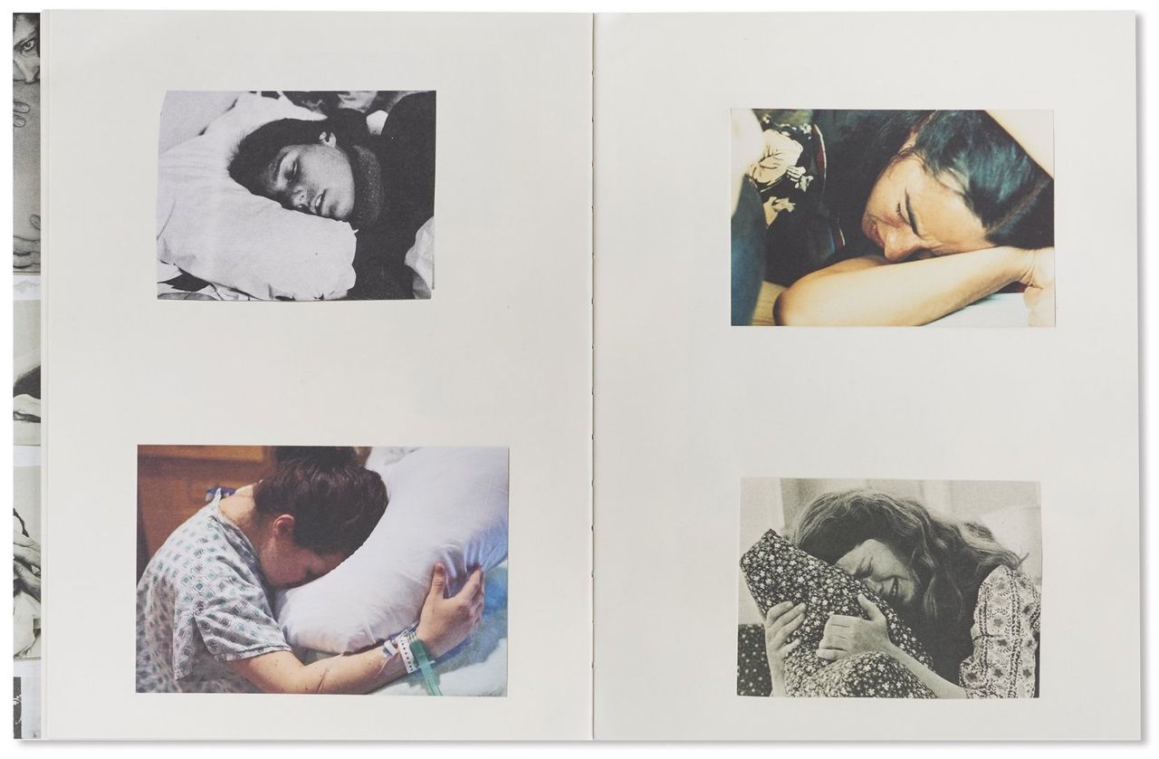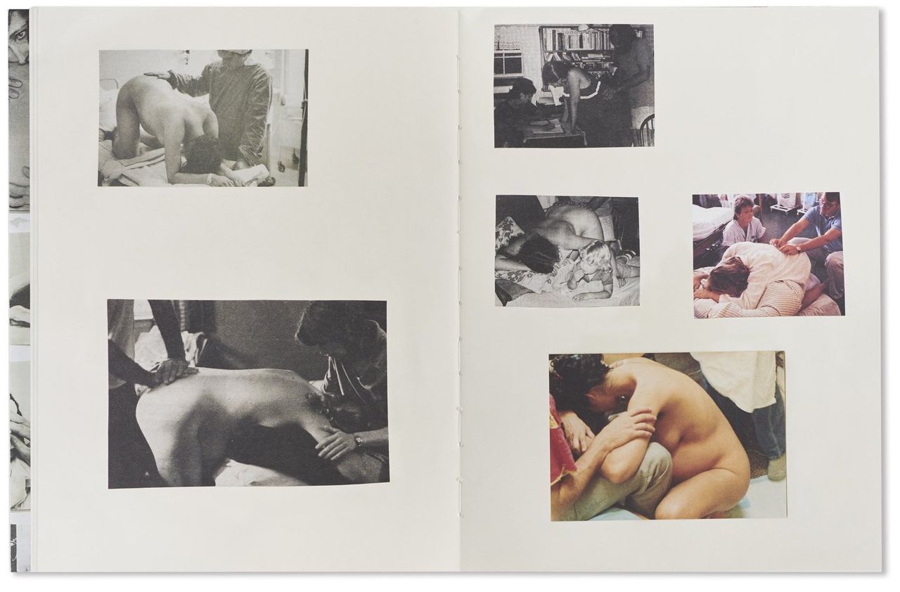 写真集の表紙(図3)は、展示の壁面の一部を再現するように(設営に用いられた青いテープはほとんど使用されていない)構成されたポスターサイズの紙が写真集を包むようなデザインになっていて、その紙の裏面と写真集の冒頭には出産した女性に、出産の時の状況を具体的に、事細かに問いかける50余りの質問が印刷されています(喉が乾いたか?多幸感を感じたか?目を開けることはできたか?分娩時に脱糞したか?近くで他の女性が分娩している音を聞いたか?などなど)。写真集では、インスタレーションのようにランダムに写真が貼り付けられるのではなく、妊娠の段階(およそ7か月頃から臨月頃)から、陣痛、分娩、出産後の授乳にいたるまでの時系列に沿ってページに貼り込まれています。見開きでは、同じような段階にある写真が選ばれて組み合わせられていて、写真同士が共鳴し、陣痛から分娩へといたる過程が、個別の経験を超えた、大きなうねりを伴う現象のように立ち現れてきます。(図4、5、6、7)