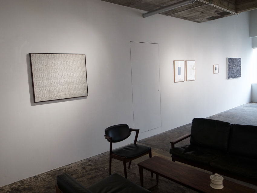 天井高4メートルと云う広い空間の、光に包まれた窓側の椅子に座って、会場を見渡している。視線の先に掛けられた作品たちとは、離れているから図像を見ているというのではなくて、存在を感じているといった感覚。並んで掛けられた斎藤義重、阿部展也両氏の小品などは、宮脇さんへのアドバイスの時期に関わるものなので、会話の余韻が立ち現れ、「ca.1960」へと続く彼女の新しい人生の扉であったように思う。57年の後、その取っ手をゆるやかに回すのは、だれだろう。開けることと閉めることが同時に行われる人生の扉。作品もそうした扉の一形態であるのは間違いない。ここからでは見えないが、対向壁には岡崎和郎さんによる一対の「HISASHI」が、題名そのままに「鳥のように」飛翔しているはずだから、心憎い演出である。柱の影に誰か居るのかしら……
