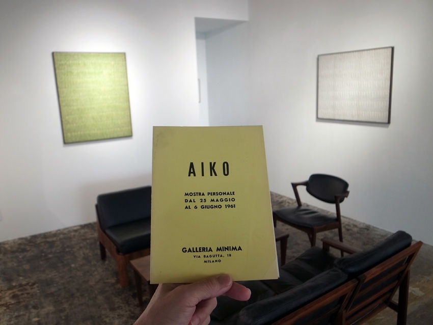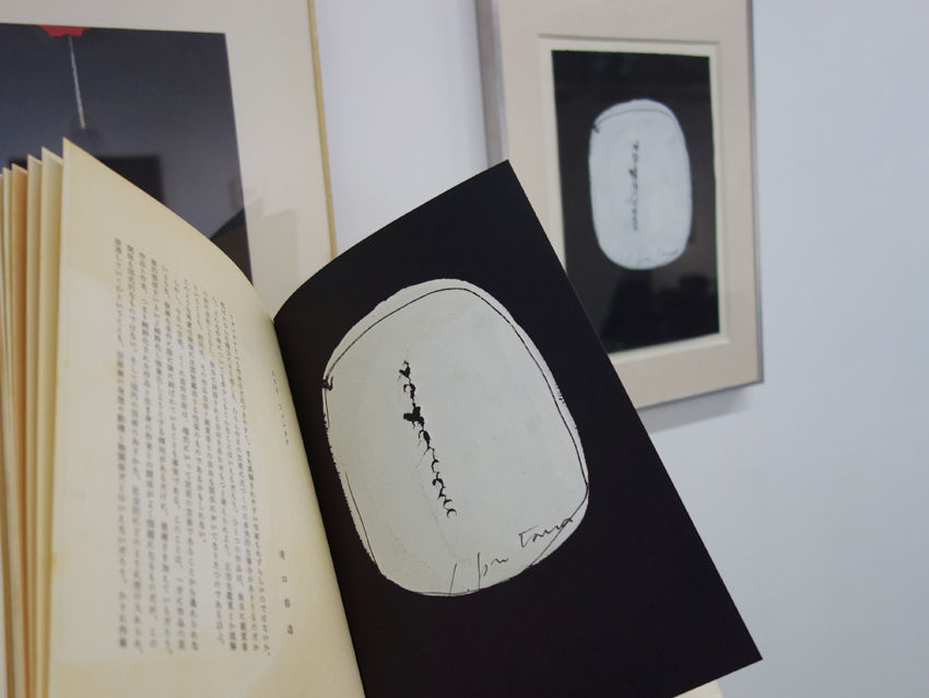 わたしは作品と人との物語に興味を持つ、そのための資料が沢山用意されているこの展覧会は、居心地が良く、宮脇さんのアトリエ、あるいは、瀧口さんの書斎にお邪魔している感覚。この幸せを解説したくなった。例えば、みすず書房が’64年に刊行した現代美術シリーズ第25巻『フォンタナ』のテキストで、瀧口さんが「フォンタナという作家ほど近づきやすく、また誤解されやすい作家もめずらしいのではないか、私はいろんな機会にそう感じる。」と書いた冒頭を飾る対向頁の図版に用いられたフォンタナの作品(’64年)が、瀧口作品(’62年、宮脇旧蔵)の横に掛けられている。その手前のテーブルの上には、名古屋のギャラリー高木で行われた宮脇さんの個展(‘80年)の折に磯崎新氏がデザインしたポスターが置かれている。これにはマン・レイが撮影した彼女の肖像写真が使われていて、その経緯などを知っているものだから、懐かしさが一杯。そして、語り部の第一人者となるのは、ミニマ画廊での個展カタログ。手に取り彼女の初期油彩を背景に写真を撮った。書体と色合い、そして、紙の手触り。ミラノの石造りの建物に差し込んでいた光が、彼女の絵肌に留められたまま、京都までやってきた感覚。考えてみれば、油彩の表面は大理石扮なのだから、親和性があるのは当然なのだ、眼の解釈は正直である。