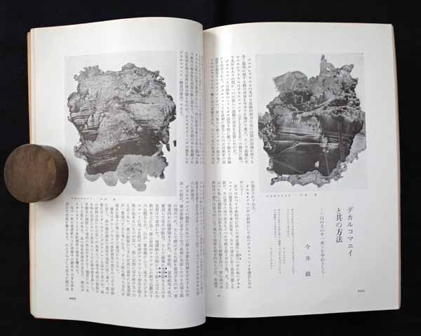 図5 『L’ÉCHANGE SURRÉALISTE』函(左)、赤版表紙(中)、青版表紙(右)また「白の上の千一夜」は、実際に今井滋のデカルコマニーと組み合わされて発表された詩です。今井の証言によれば、今井が手掛けた130枚ほどから瀧口と二人で15枚を選び、1枚ごとに瀧口が1~5行の(全体で1篇となるような)詩を書いて、1937年3月の新造型第5回展(東京府美術館)の展示壁面に、「同じ額縁の中でデカルコマニイと詩とを同時に発表した」とされています(「デカルコマニイと其の方法」「みづゑ」1937年5月。図6)。ちなみに、「みづゑ」同号には瀧口夫妻の作例が、見開きに並べて掲載されています(図7)。