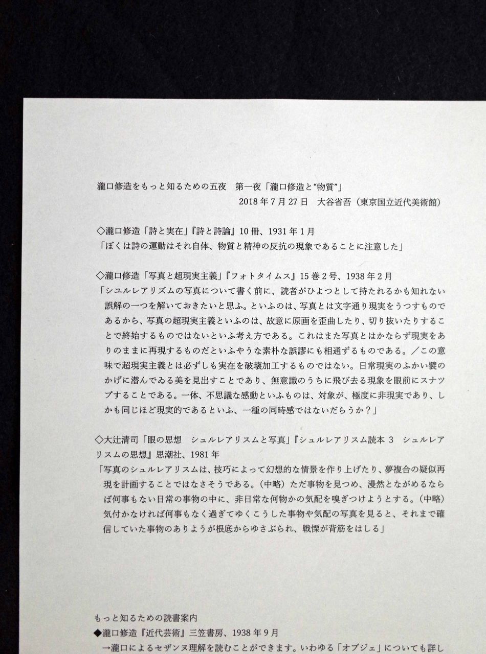 図10 配布資料「シュルレアリスムの写真について書く前に、読者がひょっとして持たれるかもしれない誤解のひとつを解いておきたいと思う。というのは、写真とは文字どおり現実をうつすものであるから、写真の超現実主義というのは、故意に原画を歪曲したり、切り抜いたりすることで終始するものではないという考え方である。これはまた写真とはかならず現実をありのままに再現するものだというような素朴な誤謬にも相通ずるものである。/この意味で超現実主義とは必ずしも実在を破壊加工するものではない。日常現実のふかい襞のかげに潜んでいる美を見出すことであり、無意識のうちに飛び去る現象を現前にスナップすることである。一体、不思議な感動というものは、対象が、極度に非現実的であり、しかも同じほどに現実的であるという、一種の同時感ではないだろうか?」