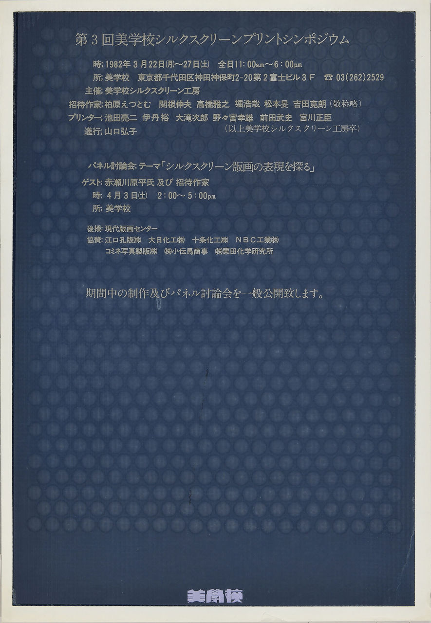 神保町にある美学校のシルクスクリーン工房は当時、岡部徳三さんが講師を勤めており、生徒たちを実戦で鍛える目的で、幾度か招待作家と美学校の研修生による公開制作をメインとしたプリントシンポジウムを開催していました。
