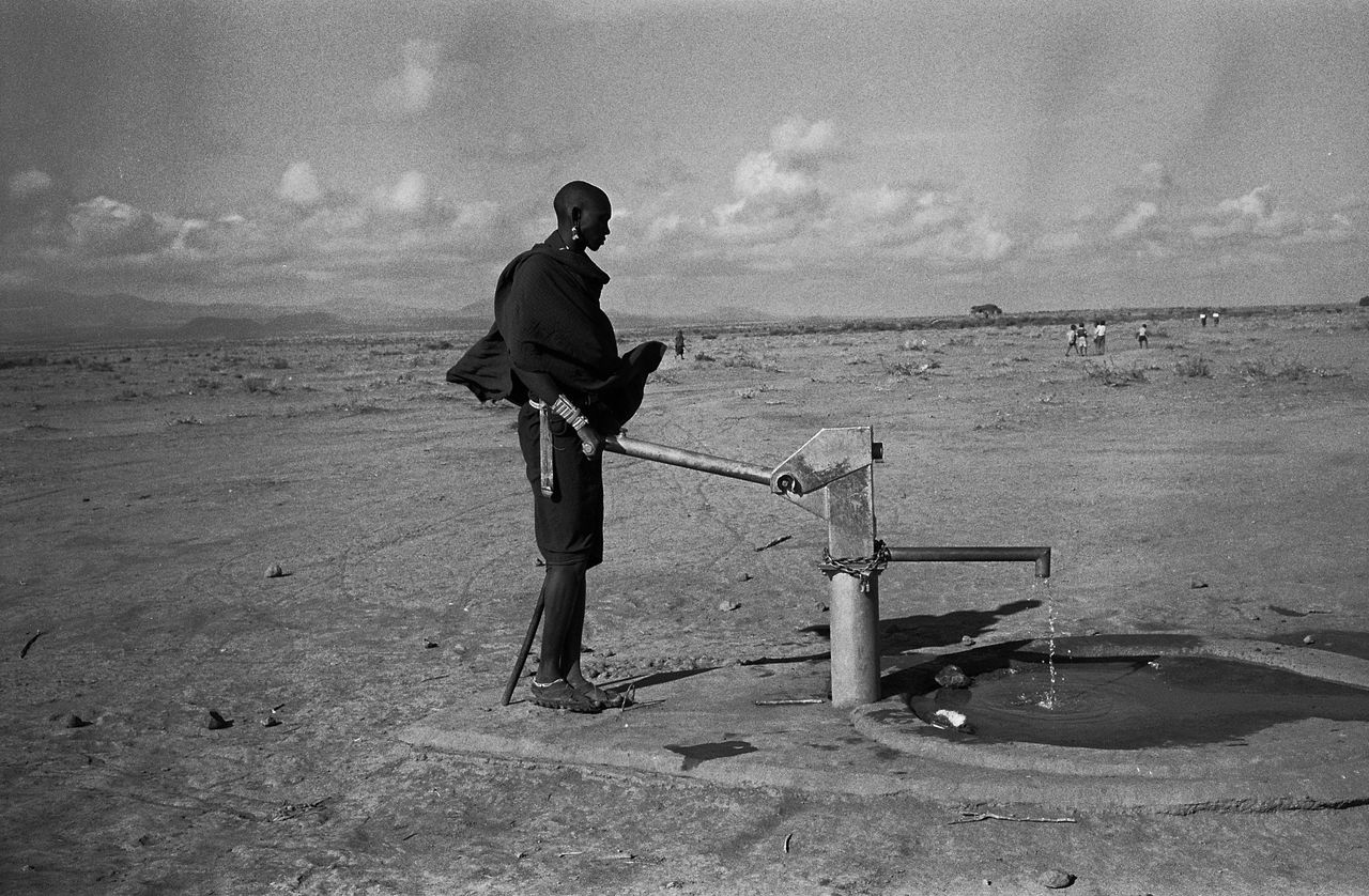 ひとりの男がその井戸にやってくる。黒い肌、まっすぐ伸びた背筋、長い足、長い腕、格好のいい頭、腕輪や耳飾り、布を巻き付けた衣装など、彼もまた日本にいる人間とはまるで姿形がちがう。彼は井戸の本体にからだの軸を合わせるように向き合うと、直立の格好でレバーを持ち上げ、ゆっくりと下ろす。ちょろちょろと水音が響く。量は少なく勢いもないが、まぎれもない水である。乾いた地表にあがってきた大地の体液である。