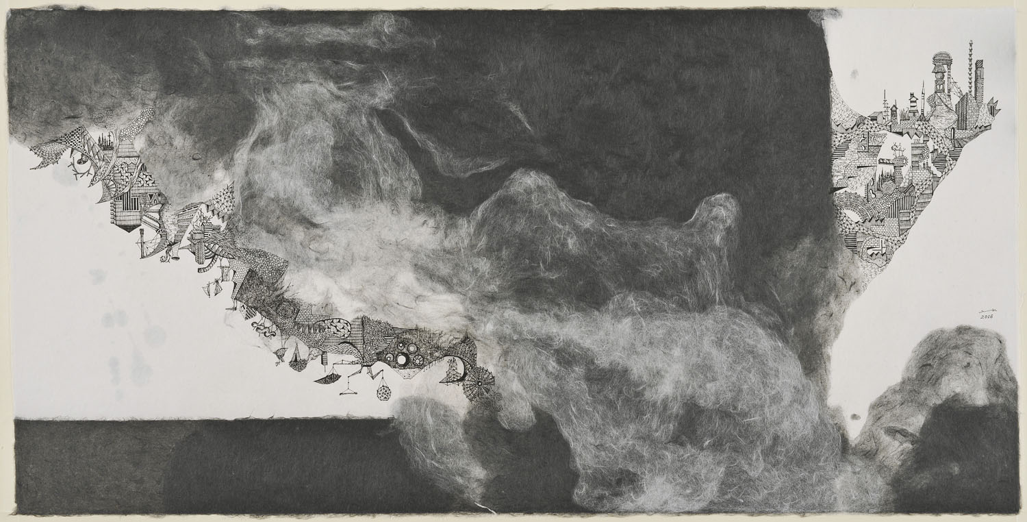 和紙の陰影を頼りに描かれた幻想都市風景が