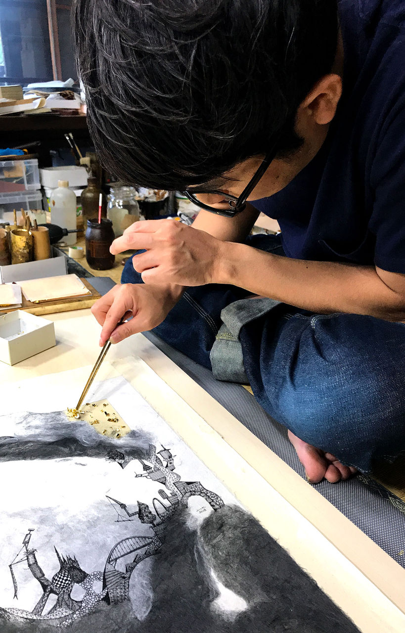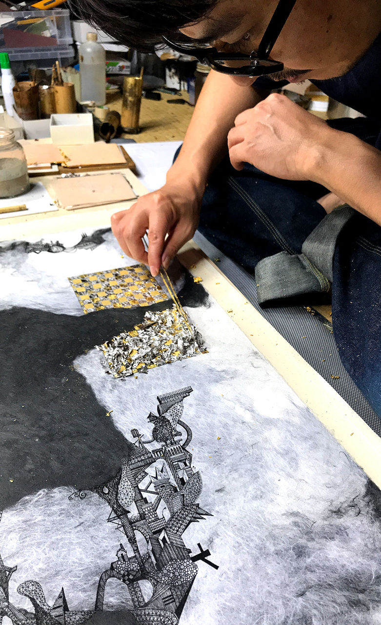 京都の工房にて、光嶋の和紙に箔押しをする野口琢郎さん