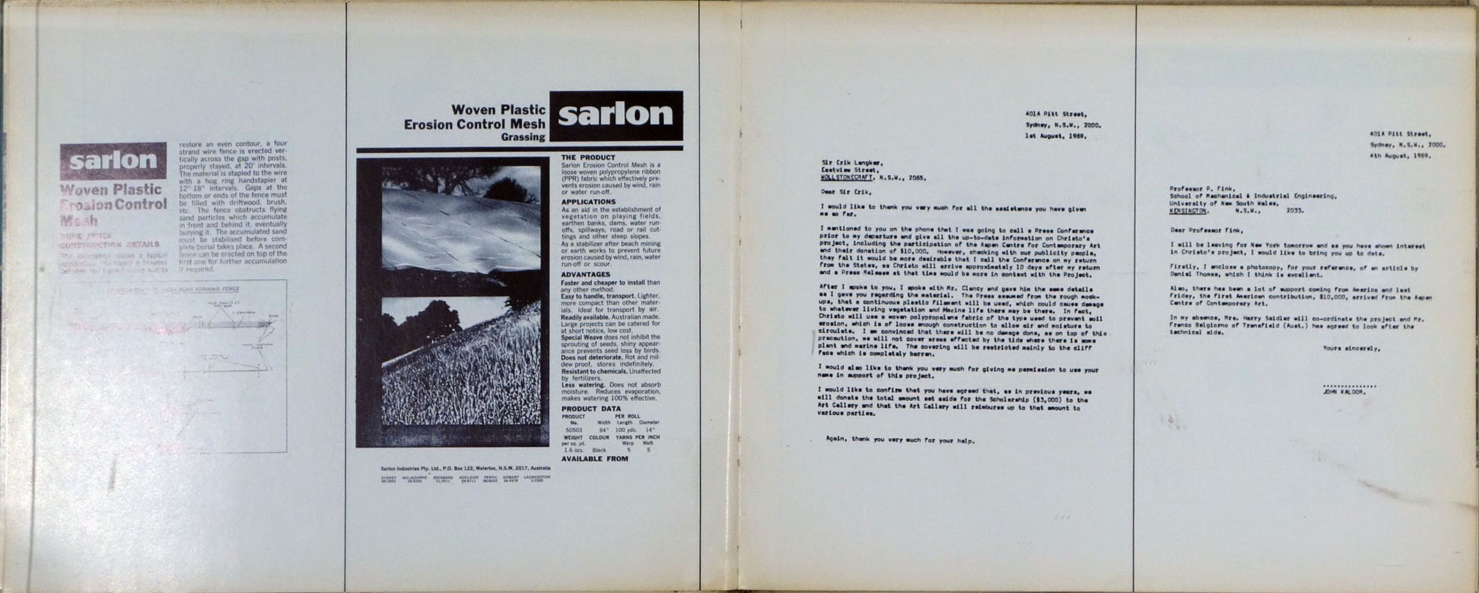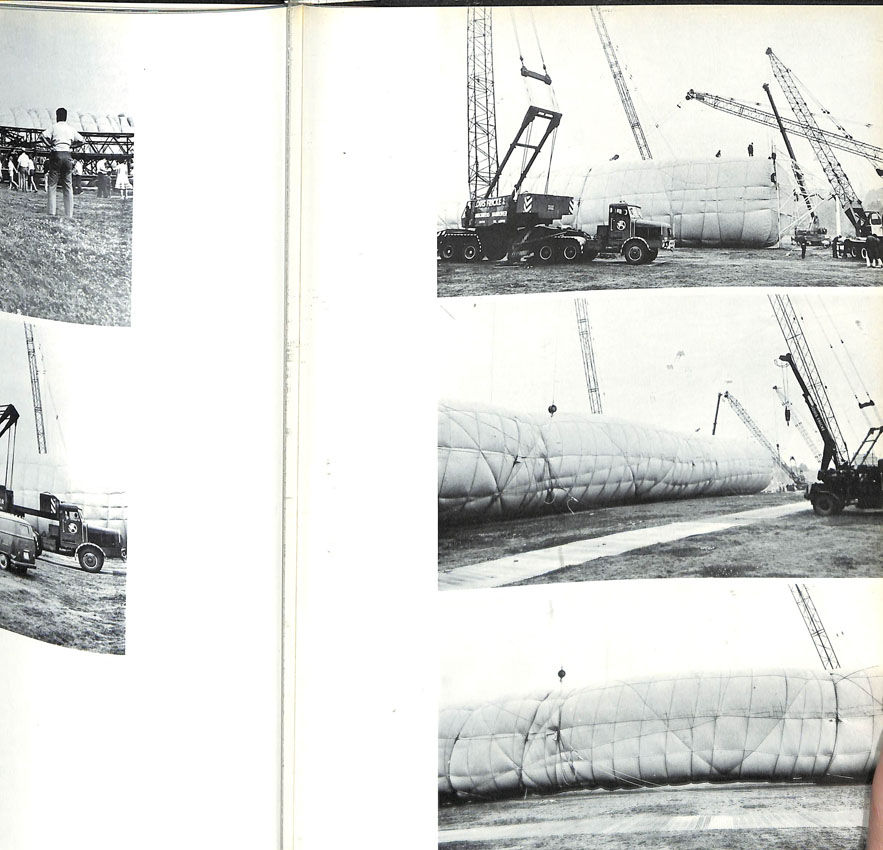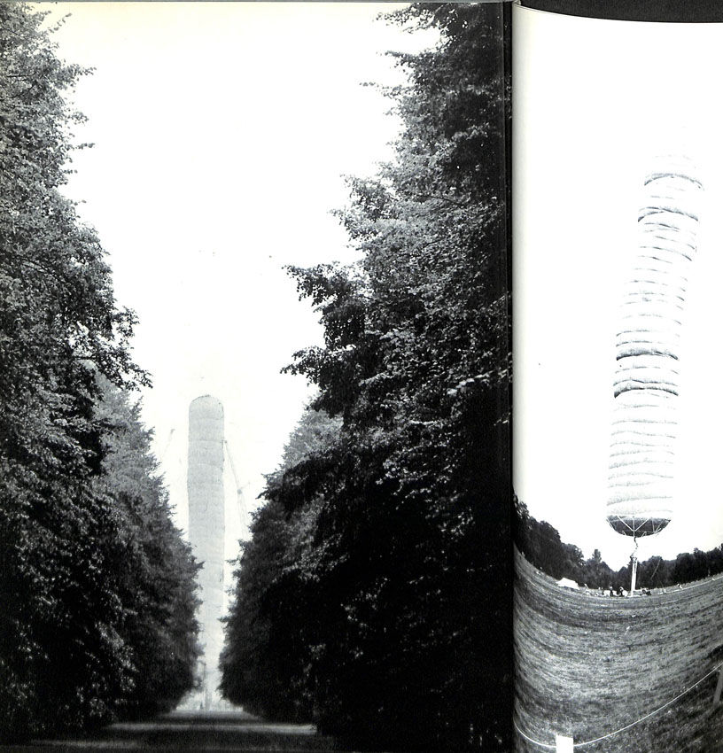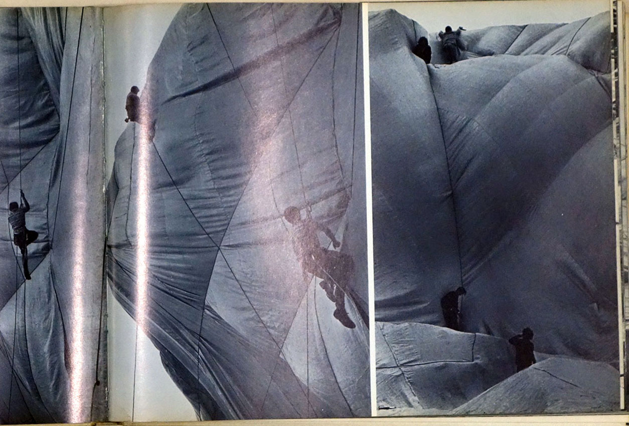 話を戻します。本格的な書籍として刊行された、最初のプロジェクトの記録集は、1968年にカッセル・ドキュメンタで実現した「5600立方メートルのパッケージ」に関するものでした。高さ約85メートルの円柱状の風船を直立させたこのプロジェクトは、技術、工事面で悪戦苦闘した難産の作品でした。完成までの過程が苦労に満ちたことから、それを本として纏めようと考えたのかもしれません。ジャンヌ=クロードがかつて、「この本を一番喜んだのは、プロジェクトのエンジニアだった、ミツコ・ザガロフだった」と語ってくれたように、全136ページの内、14ページは図面や書類、100ページ以上が工事過程の記録写真で、実現したプロジェクトを捉えた写真は、9ページ分掲載されているだけです。この配分は、最終的な物体としての作品からは見えない、創作のプレセスを知ってもらいたいというアーティストの意向を如実に反映したものでしょう。