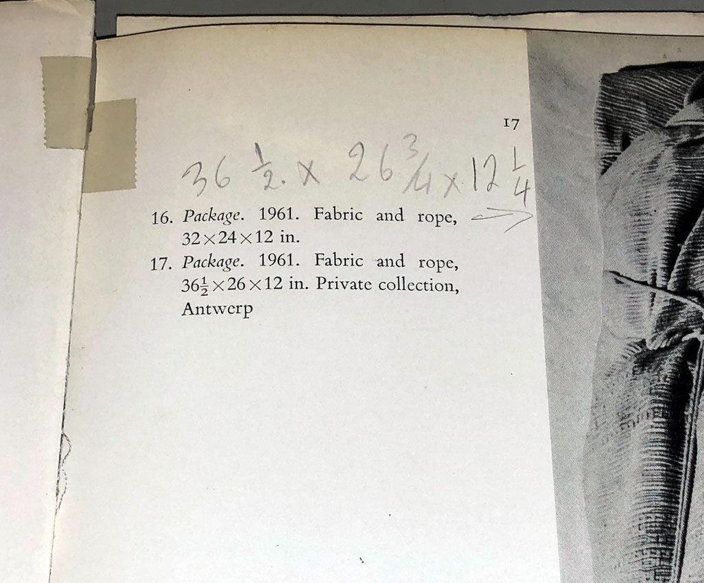 この本も、かつては入手困難でしたが、インターネットのおかげで近年は比較的容易にみつけることができるようになりました。ネット上で比較的廉価なものを見つけると、直ぐにオーダーしてしまい、今では5冊が書棚に並んでいます。その中に一冊、スペシャルなものがあります。カバーも無く、製本が壊れ、頁がバラバラになってしまっていますが、実はジャンヌ=クロードが資料として使っていたものです。私が、二人に関する文章を展覧会カタログなどに書き始めた頃に、プレゼントされたものですが、いくつかの頁には懐かしいジャンヌ=クロードの手書き文字でサイズの直しなどが書き込まれています。