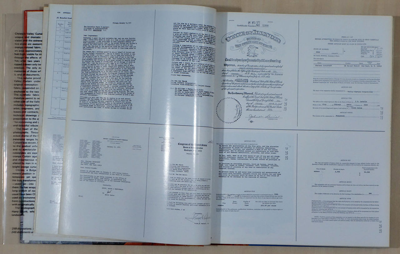 70年の作品集の縁もあってか、「覆われた海岸線」に続いた実現した大規模なプロジェクト、「ヴァレー・カーテン」の記録集はエブラムスの出版になりました。縦31センチ、横25センチ、厚さも3センチ弱ある「立派」な一冊です。このプロジェクトでは、州当局との交渉や、エンジニアリング会社との調整などにも多くの時間が費やされたことから、前の2冊を遙かに凌ぐ数のドキュメント類と交渉過程、工事中の写真が収録され、全351頁の内の約300頁を占めています。もちろん、完成したプロジェクトを様々なアングルで捉えた写真も50頁近く掲載されています。