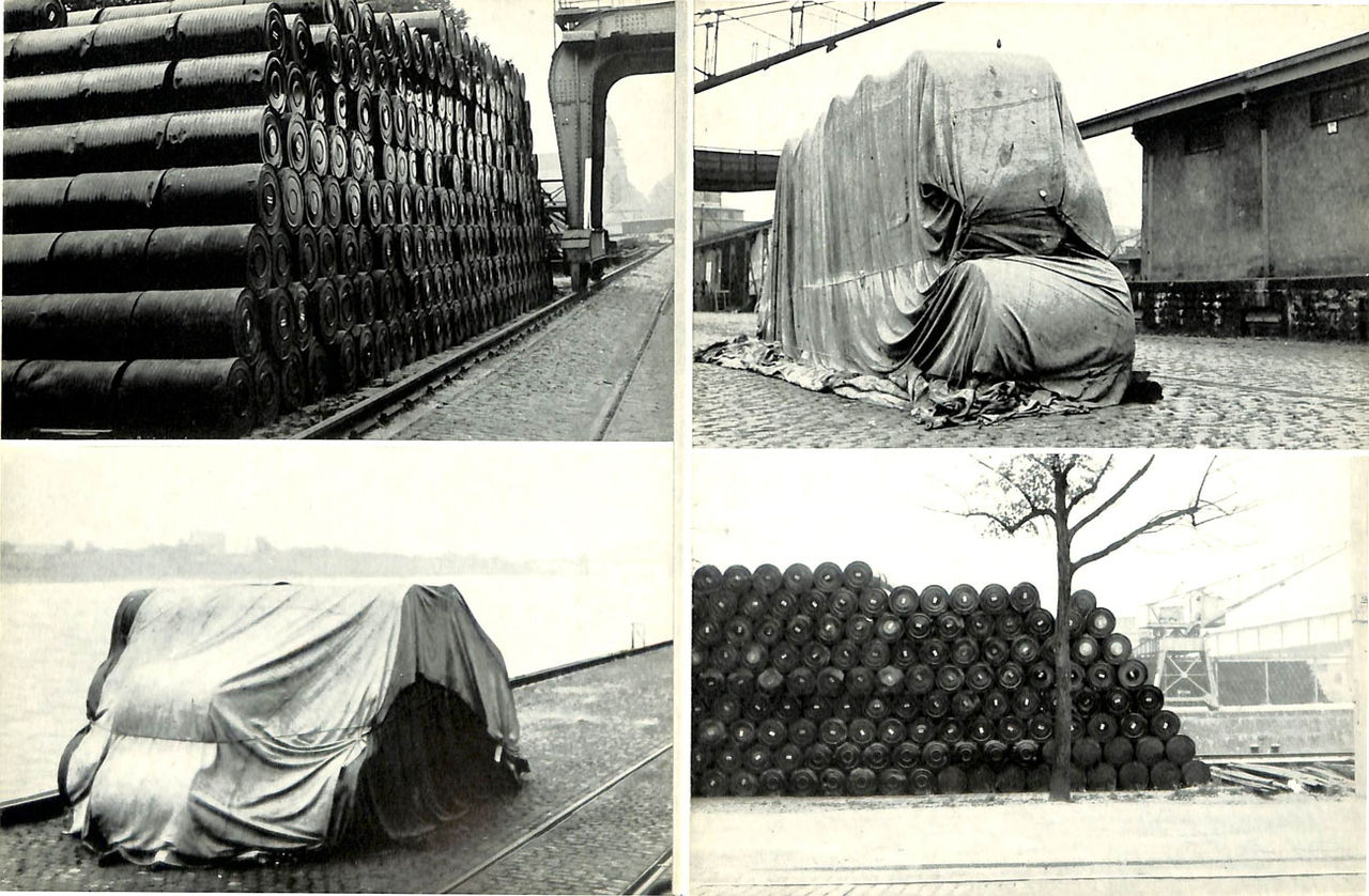 プロジェクトの記録としての本の最初に一冊は、二人にとって最初の野外作品、1961年にドイツで実現した「積まれたドラム缶と埠頭のパッケージ」に関するものでした。といっても、これは本格的な書籍ではなく、1枚のシートを三つ折り折りにした、合計6ページのリーフレットでした。プロジェクトの白黒写真が4枚掲載されているだけですが、このプロジェクトを知るための貴重な資料となっています。