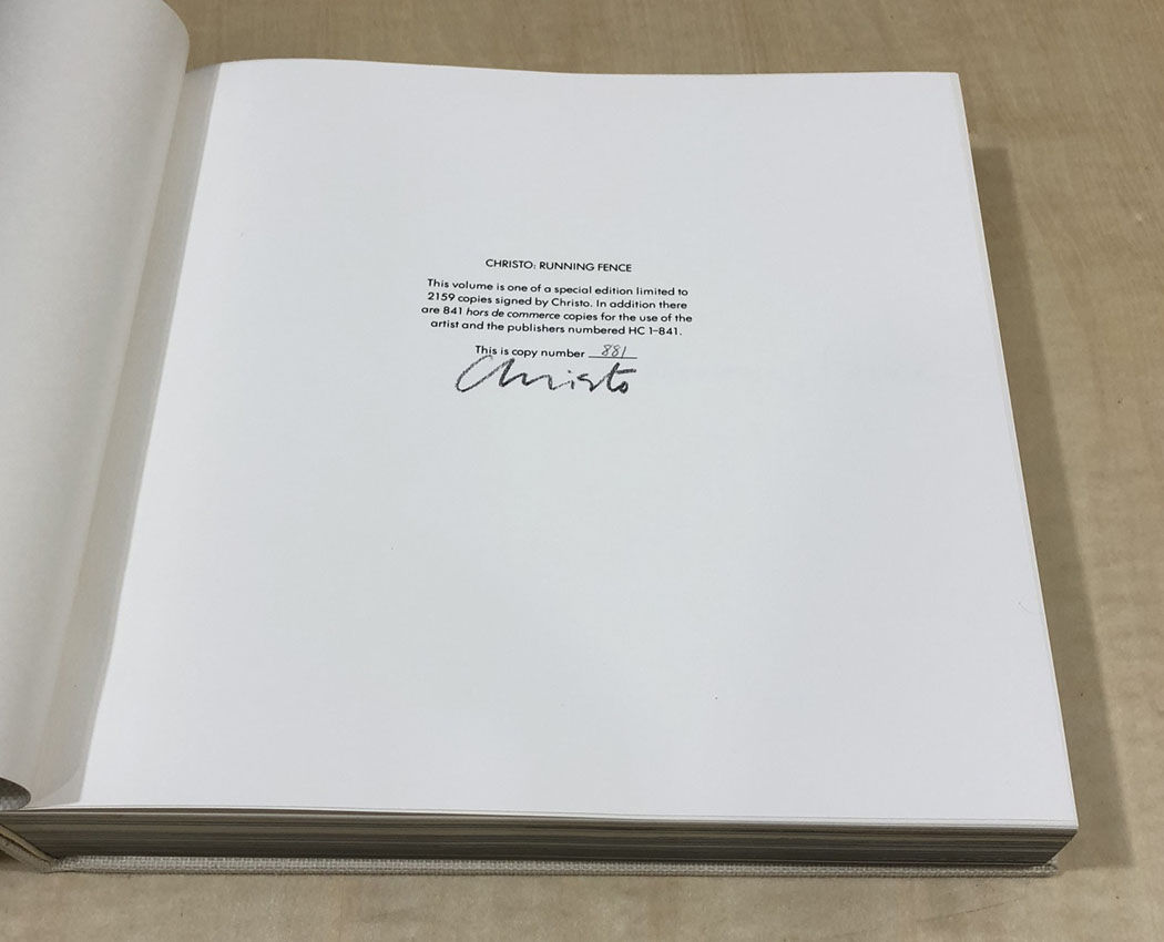 さて、「ランニング・フェンス」の出版予定の予定を知り、すぐにアール・ヴィヴァンに注文を入れたところ、予定日よりも早くに入荷の連絡がありました。定価200ドル、当時のレートで5万円以上、学生の私にとっては世紀の買い物でした。そこでショッキングな問題が発生しました。重い本を持ち帰り、早速に開いてみると、クリストの直筆サインと限定ナンバーは入った頁が見つからないのです。出版カタログには、サイン、ナンバー入りと明記してあったのにです。