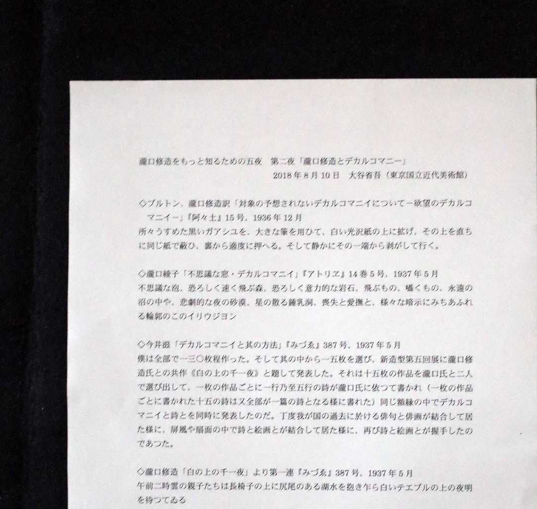 配布資料に再録された瀧口綾子の「不思議の窓・デカルコマニイ」(「アトリヱ」1937年5月)の中の、たいへん詩的で美しい次の一節を読むと、綾子もまたイメージが固定されないところにデカルコマニーの魅力ないし本質を見出していたことがわかるでしょう。