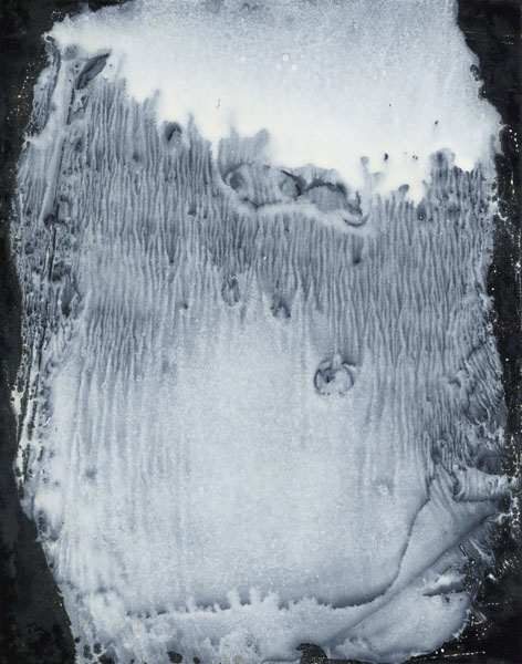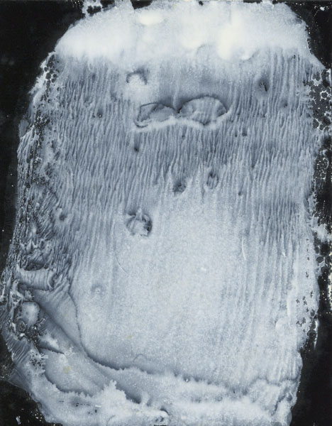 ここで瀧口修造のデカルコマニーを改めて見ますと、その大きな特徴は、イメージが固定化されない、ということにあるように思われます。つまり、ドミンゲスやエルンストのデカルコマニーの場合は、出来上ったデカルコマニーに対してさらに筆が加えられ、「ライオンの姿」「川の流れ」など、イメージが特定の像に固定化されているものが多いのに対して、瀧口修造のデカルコマニーは、描き加えは行われず、イメージが絶えず移り変わっていくのが特色です。おそらく唯一の例外は、富山県美術館蔵のデカルコマニー連作100点「私の心臓は時を刻む」の扉絵「詩人の肖像」(図9)で、これは緑色の絵具で描き加えられた眼によって、「詩人の肖像」という具体的なイメージに固定化されています。