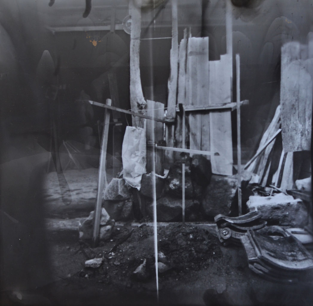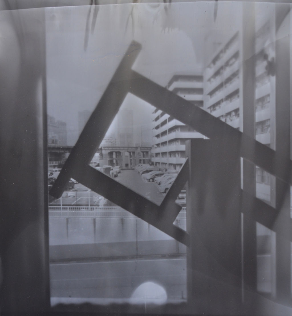 300mm立方のハコでできた針穴写真の露光時間は晴れの日だとおよそ15分。行き交う人たち、あたりを飛ぶトリやうろつくネコたちも確実に撮影される写真の中には写り込んでいるはずであるが、露光時間が長すぎて動くモノはほとんどその像を結ばないのである。そんなうごめく周囲とともに動かないハコが、まるで術をかけられて石と化した何某かのように、写真の中に像として現れる。そして、ほぼ唯一の動かない被写体としてのハコは、都市あるいは農村の幅のある時間、気流(あるいは気配か)を取り込むための額縁=フレームとして、印画された写真の中にセットされる。