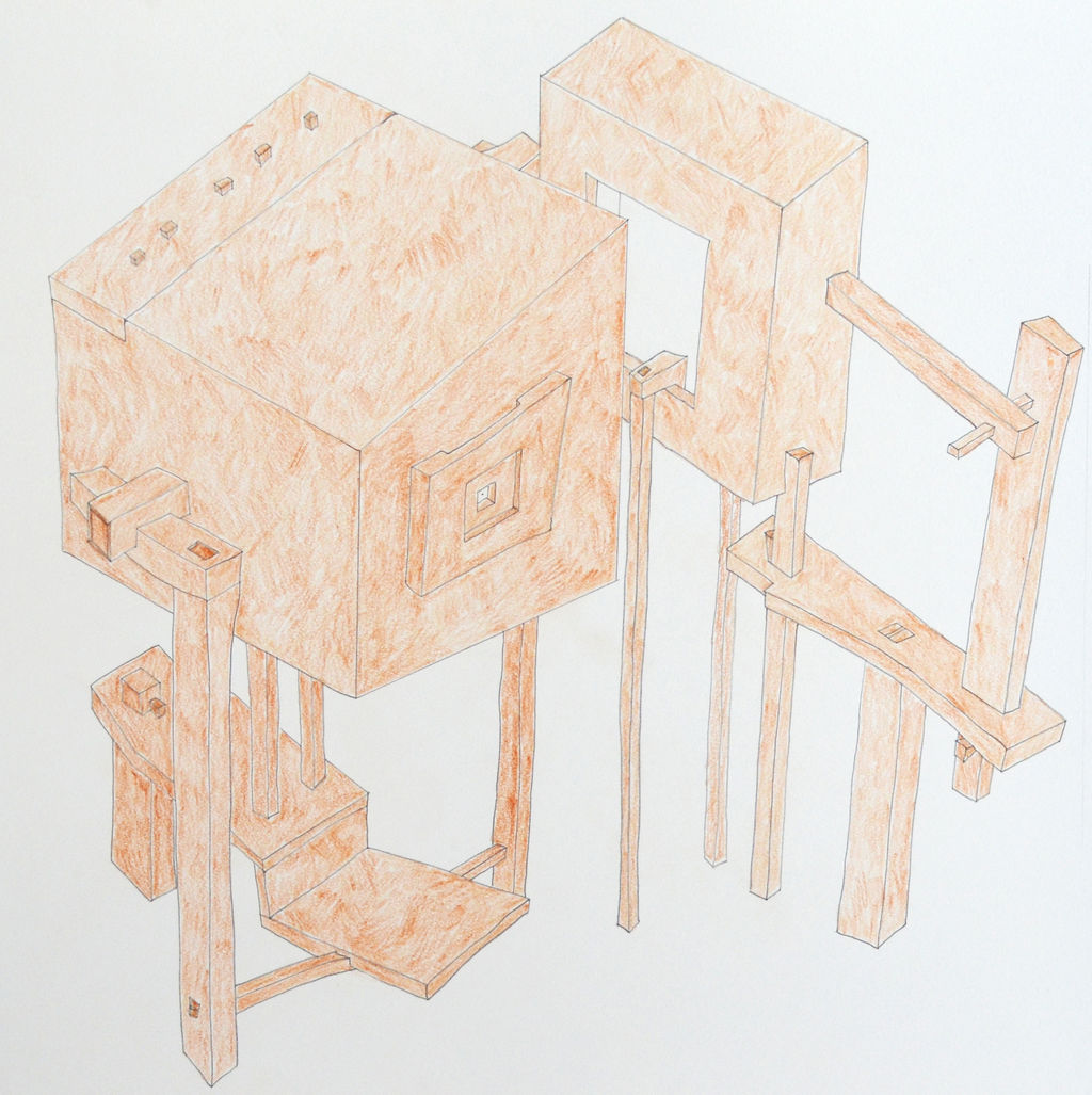 紙と鉛筆でモノとモノの取り合い、対峙関係を考え、木材を手でイジってハコを作り、ハコを使って撮影した写真の時折の意外な出来上がりにハッとし、また紙の上のドローイングでその驚きを描画する。そんないくつかの次元の行ったり来たりを、自分の身体の移動体験の中でとりくんでいる。