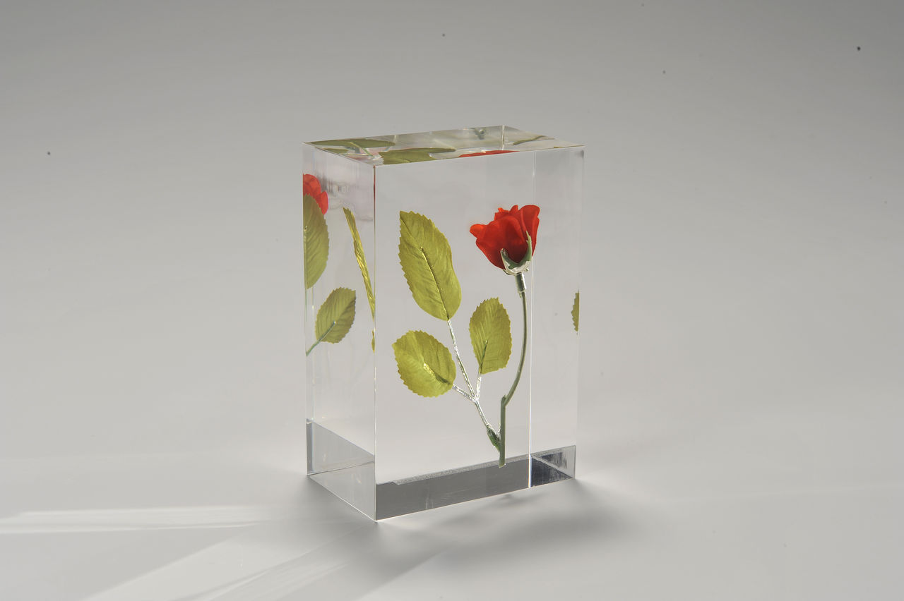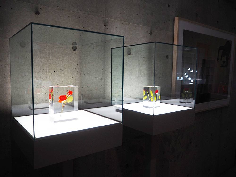 立体作品としては、浮遊感と透明感にあふれた代表作『Cabinet de Curiosite(カビネ・ド・キュリオジテ)』はじめ、フラワーベース、《ガラスの椅子》のミニチュア作品、繊細な秒針が時を刻む「Just in time(時計)」、代表作《ミス・ブランチ》のマテリア ルとして使われた薔薇を封印したアクリル・オブジェなどを展示しています。