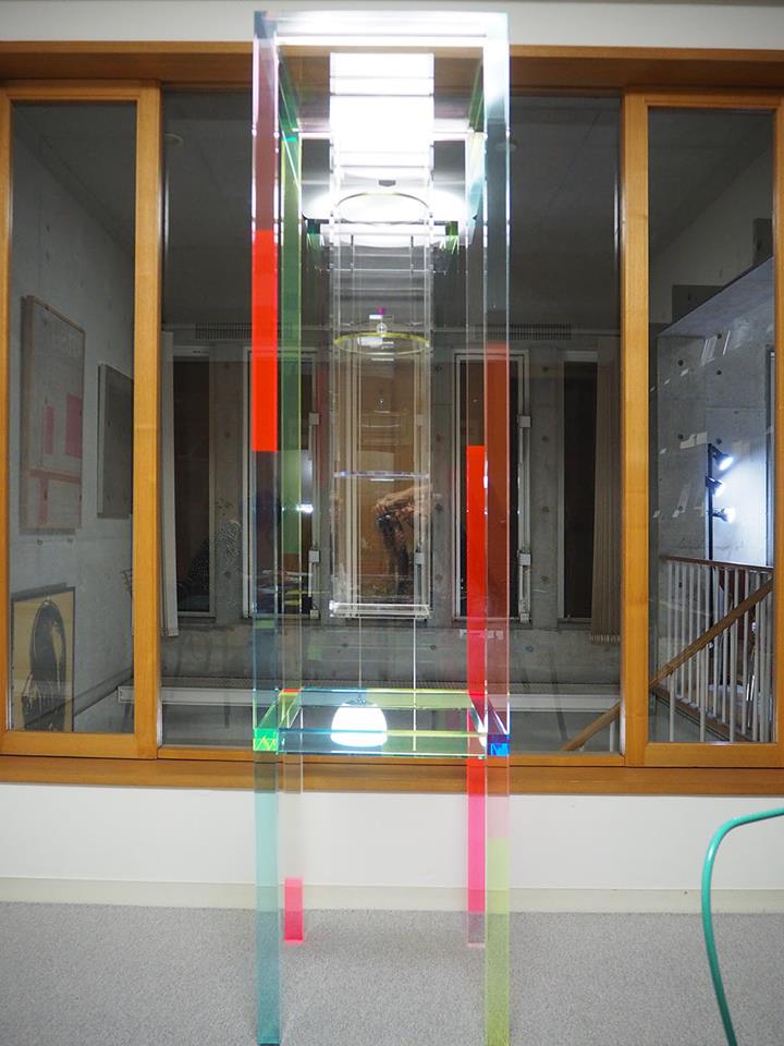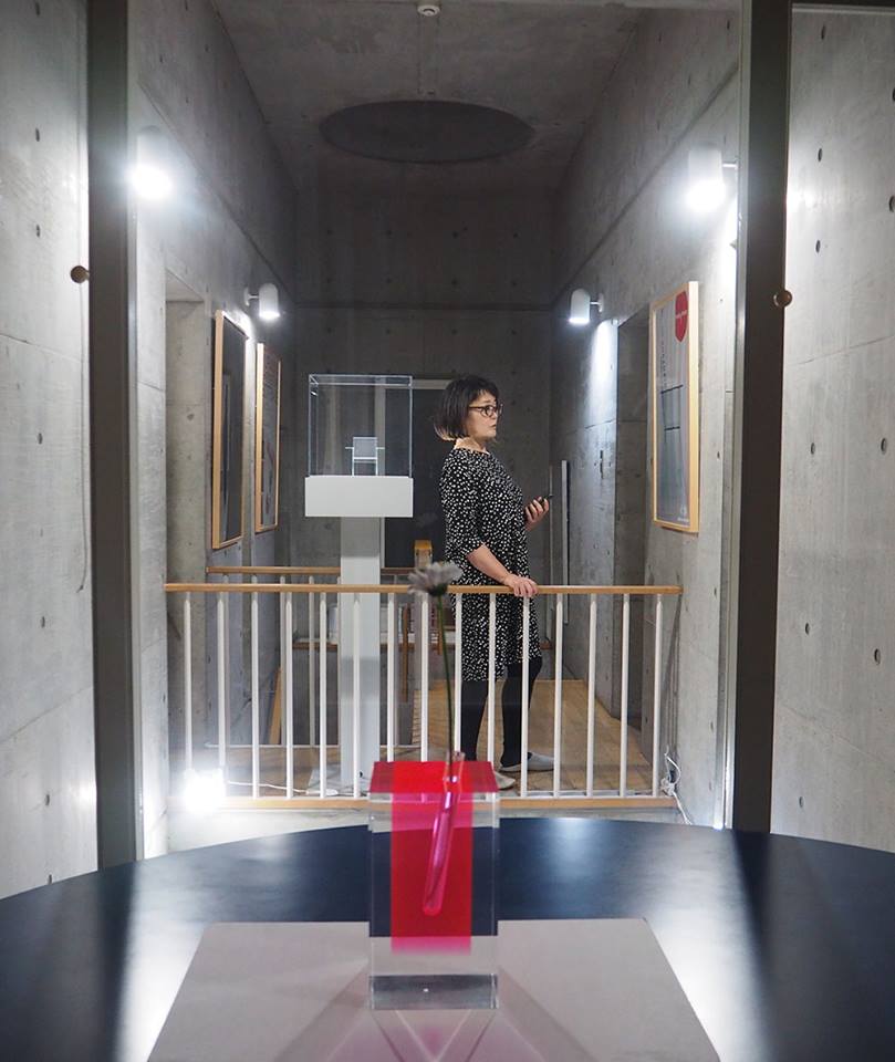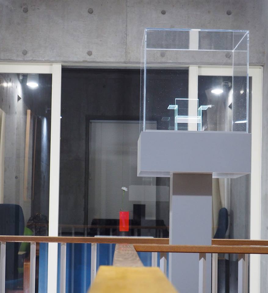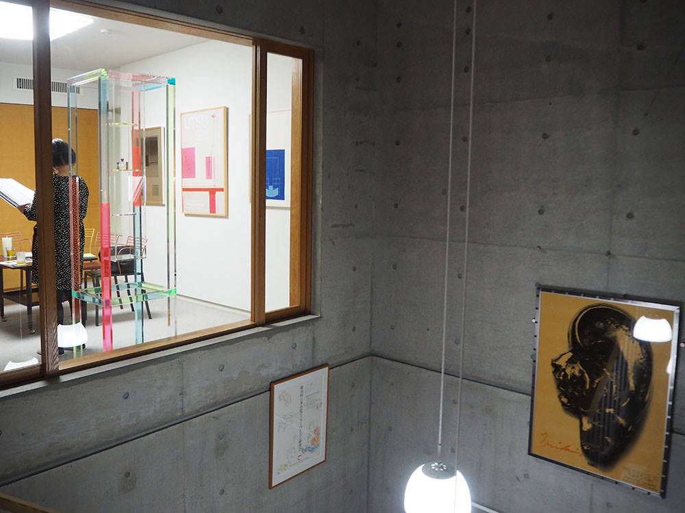 青山から移転して一年と少し、今回はぎりぎりまで展示に四苦八苦しました。一週間前から20点以上も用意した額装作品(当然、全部は展示できない)をあっちに掛け、こっちに架け替え、大小のオブジェ作品を三階にあるいは二階に移し、図書室の本箱(モンドリアンです)を空にして倉俣資料及び希少な絵葉書に展示換え、応接用のテーブルや椅子も思いきって撤収。図書室の大きな窓にあった手すりも阿部先生の許可を得て撤去! 前日遅くにやっと最終的な展示が確定したという次第です。