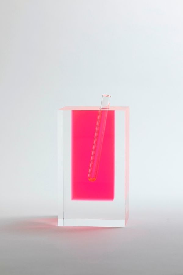 《カビネ・ド・キュリオジテ》は、1989年11月にパリのギャルリ・イヴ・ガストゥ(Galerie Yves Gastou)で開催された個展のために制作され、やはり同展に向けてつくられたサイドテーブル《Blue Champagneブルーシャンパン》(1989)やピンクのアクリルブロックの花瓶(図2)とともに倉俣が本格的に着色アクリルに挑んだデザインである。