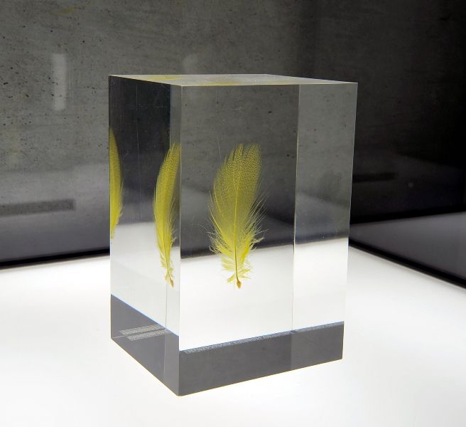 重力から解放されて、アクリルの中に浮く、バラの造花や羽根たち。時の流れによって刻々と変化するこの空間に、時間の静止した直方体の空間を生み出したようでした。