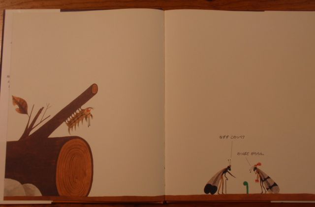話にまとまりがなくなったが、最後に、この絵本のもうひとつの素晴らしいところは、空間を表す白の部分が美しいこと。この白い部分が、自分と同じスケールに見てしまいがちな虫の世界が実は地面にごく近いところで展開されていることを、思い出させてくれるのである。