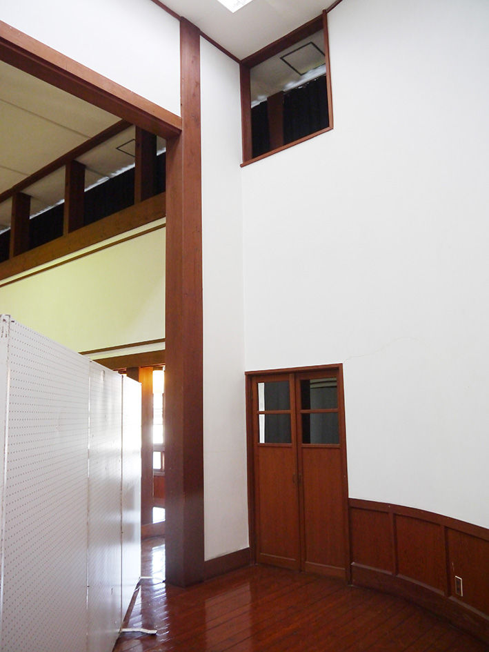 ステージの両脇と2階の東西にあるギャラリーの手摺部分の漆喰壁には、細い木材のモール(押縁)が取り付けてあり、白壁に一種の緊張感を与えて空間を引きしめている。