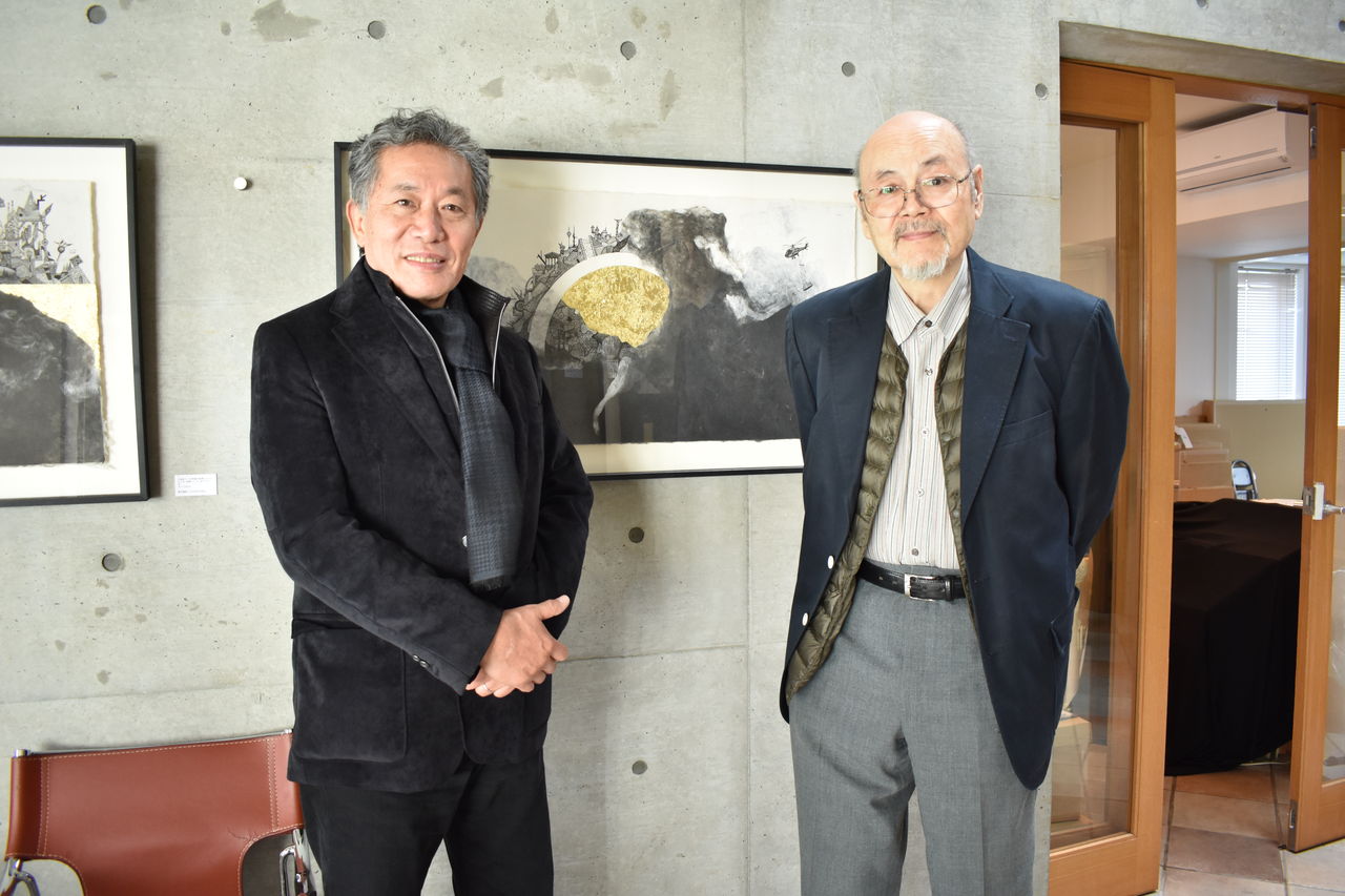 左から、社長、名越康文さん、吉本ばななさん、画廊亭主<光嶋裕介新作展―幻想都市風景 GOLDへ。ときの忘れものはもともと阿部勤さん設計の住宅ということで、自分の家に飾るイメージが想像しやすいというのはなるほど。まさか撮影していいと思わず痛恨のカメラ不携帯…。この写真の何百倍いいのでぜひ生で。和紙にも幻想都市風景が現れている。黒がいい