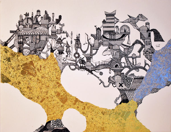 和紙にインク、一部金箔・プラチナ箔を押した「幻想都市風景」シリーズでは、レンガ造のアーチ、尖塔、材木など種々の構造物が、植物のように、或いは成長する結晶のように展開する。都市が静かに脈動しているようで強く惹き付けられる。
