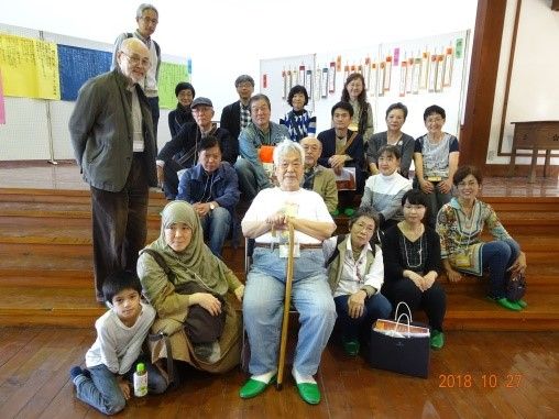 久保講堂内ステージの前で、靉嘔先生を囲んで