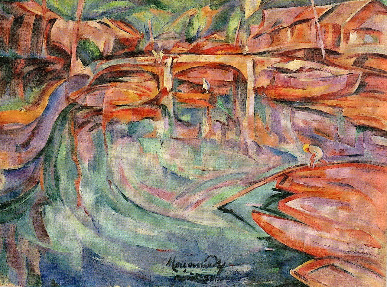 大正12(1923)年5月、村山知義は自宅アトリエで「村山知義、意識的構成主義的小品展覧会」を開催する。これに未来派美術協会に属していた柳瀬正夢、門脇晋郎、尾形亀之助、大浦周蔵が訪問することになるが、期せずしてみな落合またはすぐ近くに住居していた。このメンバーたちが何度か会合をかさねてグループ・マヴォ(MAVO)を結成する。7月のことである。7月末にはMAVOとしての第一回展覧会を浅草伝法院で開催する。