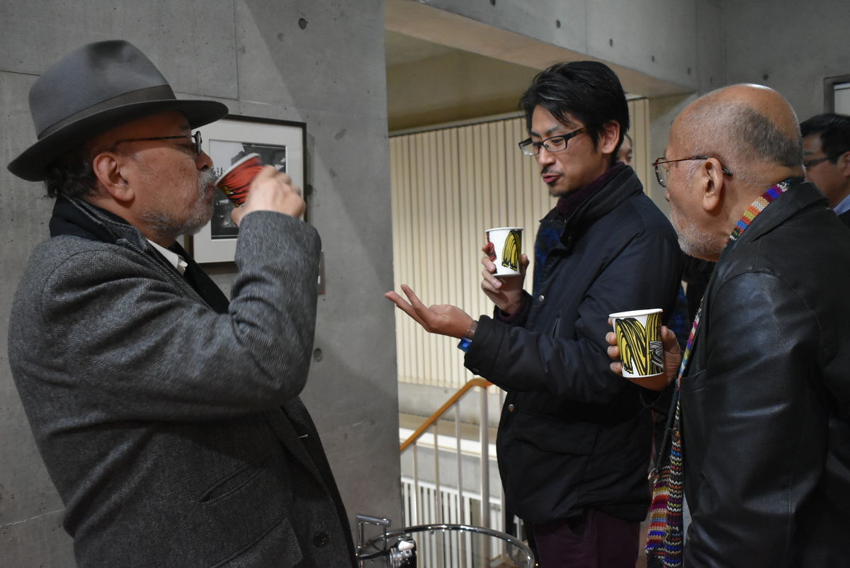 左から阿部勤先生、難波和彦先生、画廊亭主