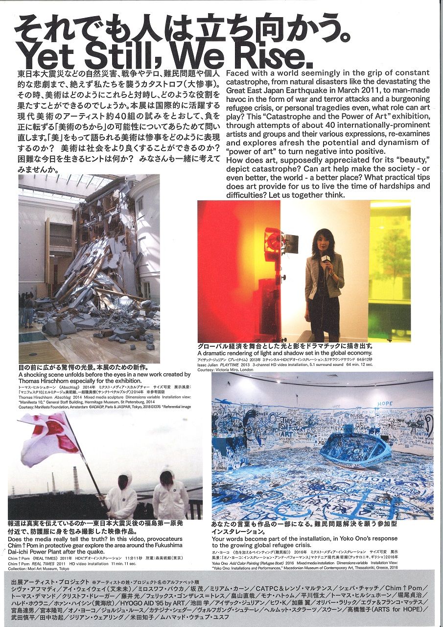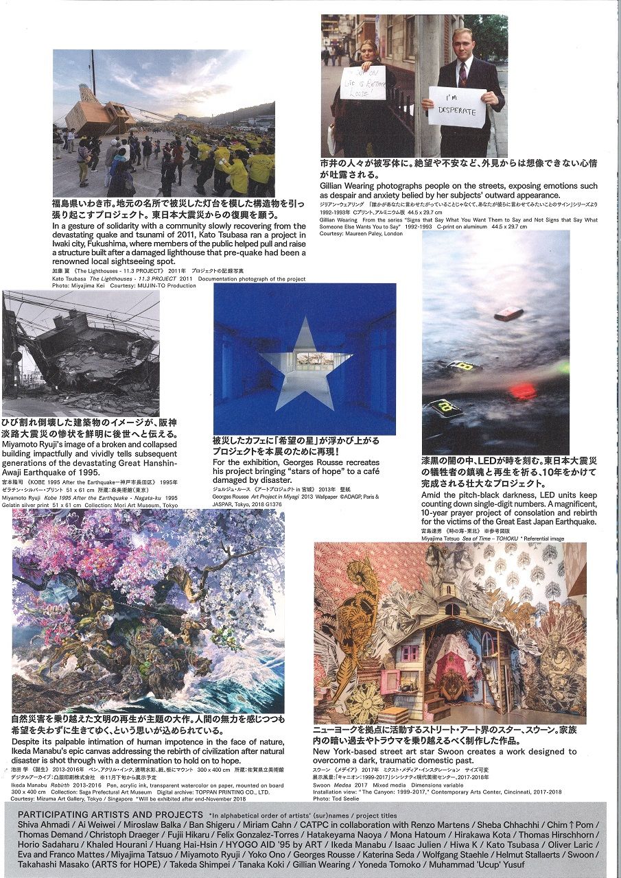 カタストロフと美術といえばすぐ思いつく絵画や写真がある。だがそれどころではなく、じつに多様な美術的反応が会場に充満していて、しかもどの作品も評価の点では不計測・不安定な状態にあり、それは例えばむかしから、地震や火事の記録を見るときにつきまとう気持ちから変わらず続いているが、その表れの振幅がこの会場では地球規模となって、いちだんと強い。作品そのものだけでなく、会場の構成が、なんというか虚の空間をところどころに組み込んで、作品を観賞しに来た者を途方にくれさせるほどの力がはたらいている。カタログはそれのかわりに説明で整えられているが、当会場の忘れ難い空間を体感しておくためには、やはり何を措いても見ておいたほうがいいと思う。カタストロフがますます生活・人生に不可避の主題となってくるにちがいない、これからのためにも。