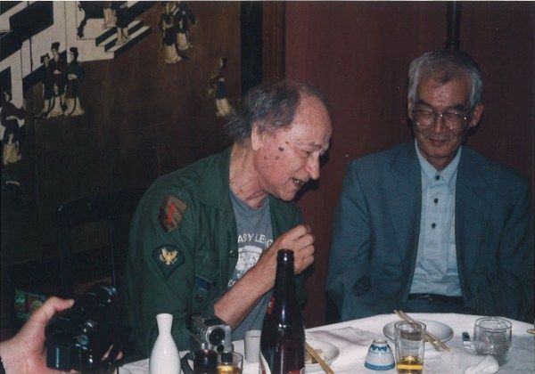 亭主のまずい歌に応えてリトアニアの民謡を歌うメカスさん。右はリトアニア語が専門でメカスさんの詩集の翻訳者・村田郁夫さん。この夜のことは芳賀さんの寄稿「天使の謡う夜に」をお読みください。