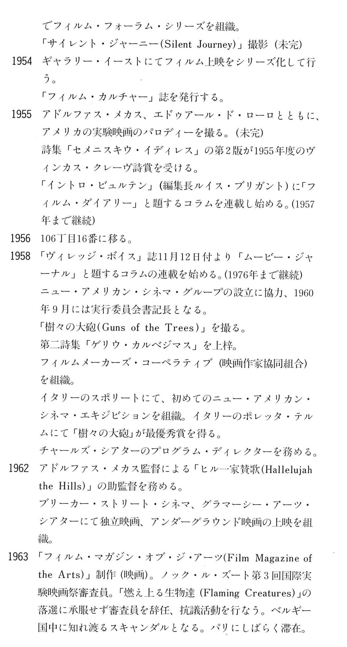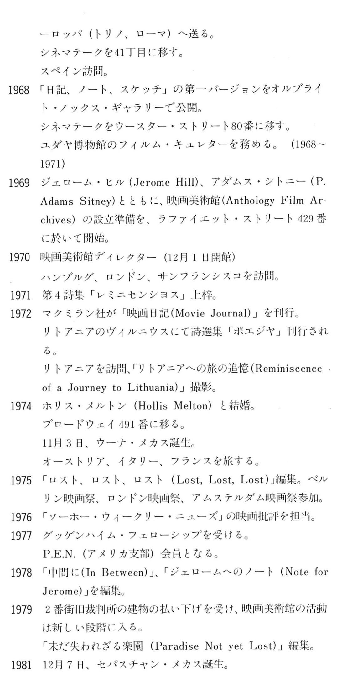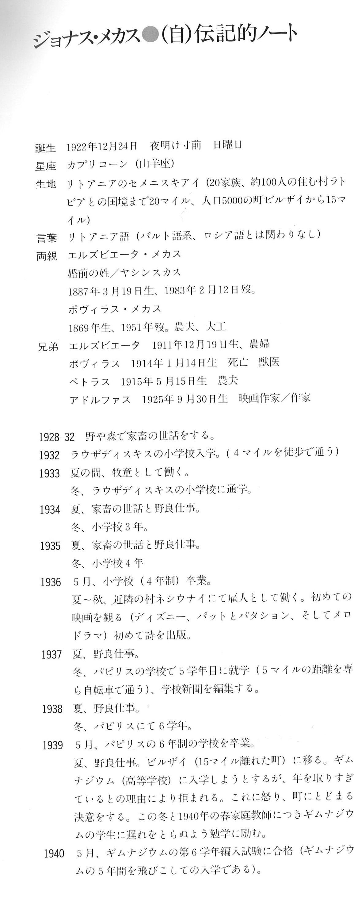 続いて掲載したメカスさん自身による略歴/(自)伝記的ノートがいま読み返してもひしひしと迫るものがあります。