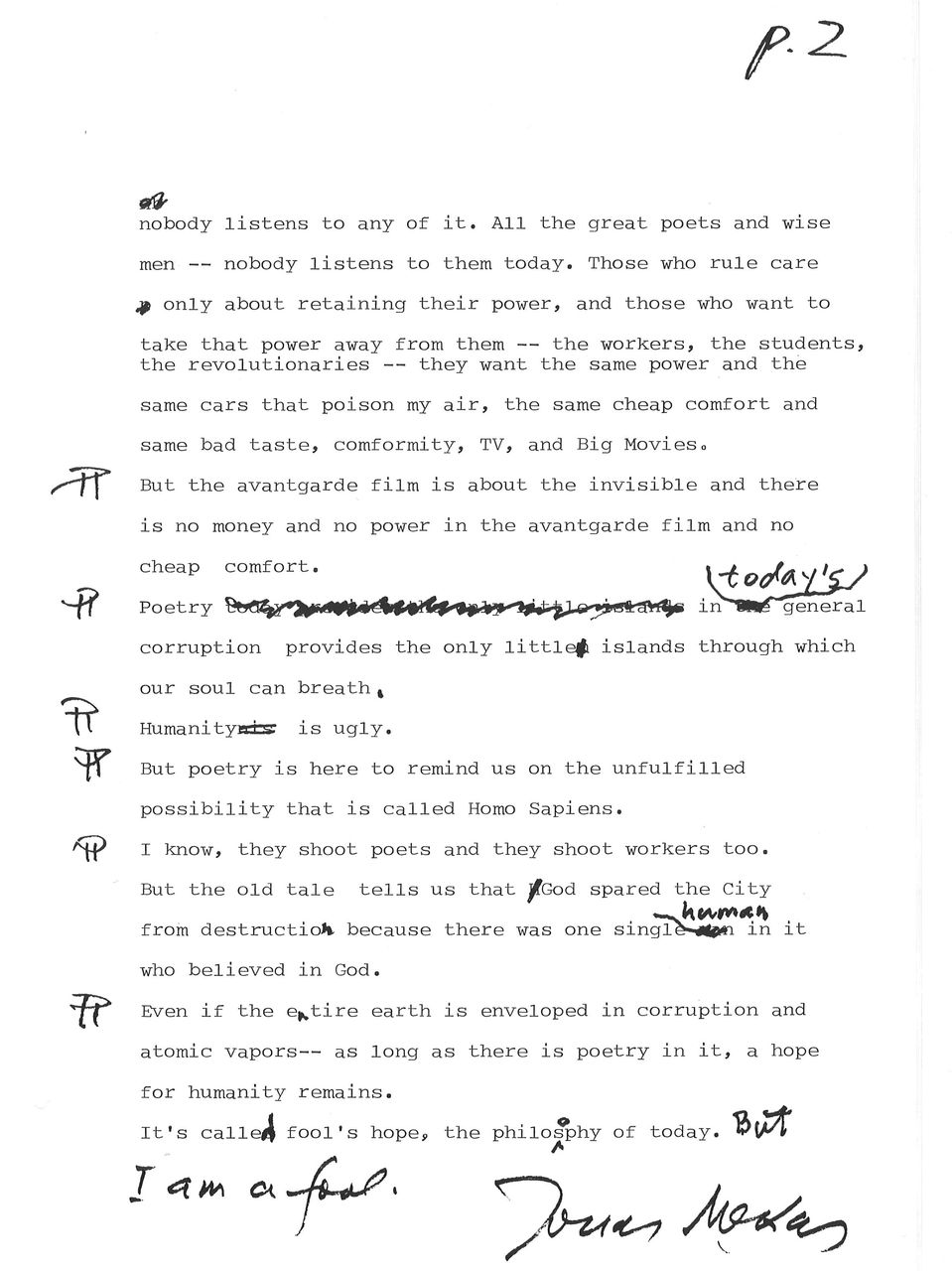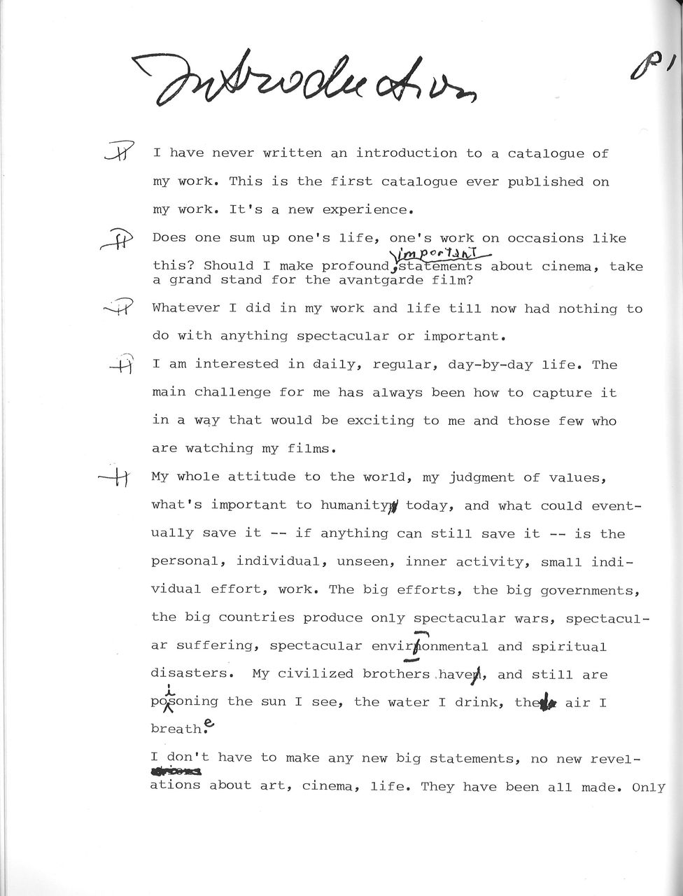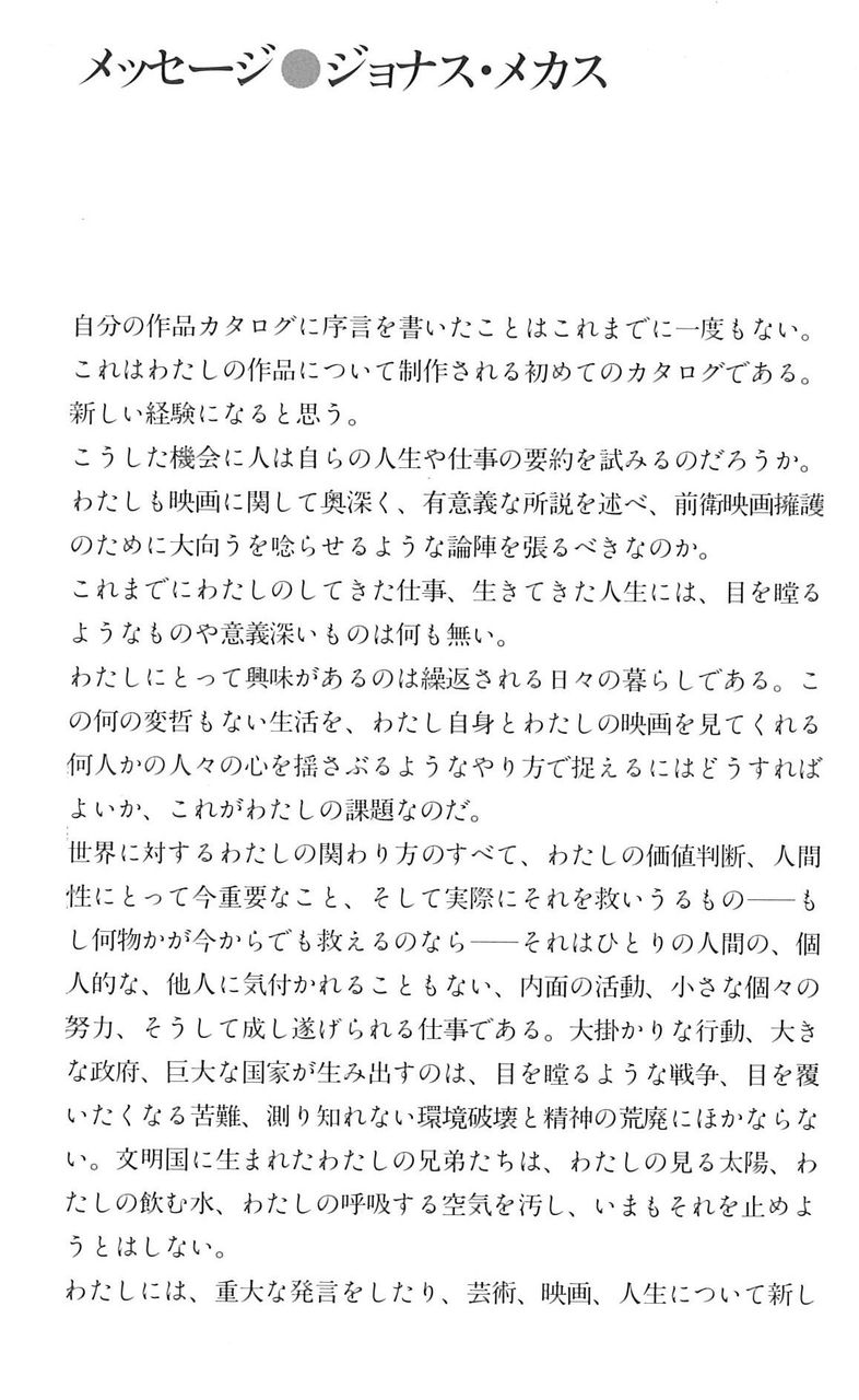 カタログの冒頭にはメカスさん自筆(タイプ)の「メッセージ」と「(自)伝記的ノート」が掲載されています。