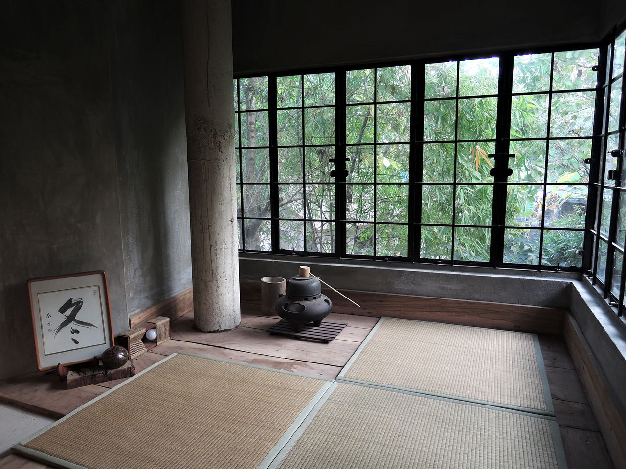 DSCN5734庭に大きく床を張り出した、二階の小室。床が貼られ、半畳が並べられていた。冬なので本来は炉を切らねばならないのかもしれないが、冬といえどもインドの冬の昼間は結構暖かいので、日本とは別種の設えを編み出す機運としてむしろ好意的に捉えるべきだろう。